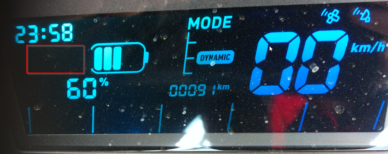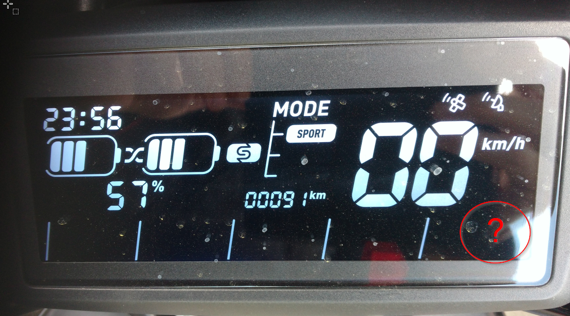 Der Akku sieht auf dem ersten Blick gleichmäßig entladen aus. Ist er aber nicht. Bei der Fahrt hatte ich schon erkannt, das ein Akku früher den Balken verliert. Dabei verschwand kurz vor dem Foto in der rechten unteren Ecke eine "61!". Ist das eine Fehlermeldung? Bei der Fahrt hatte ich das auch nicht gesehen.