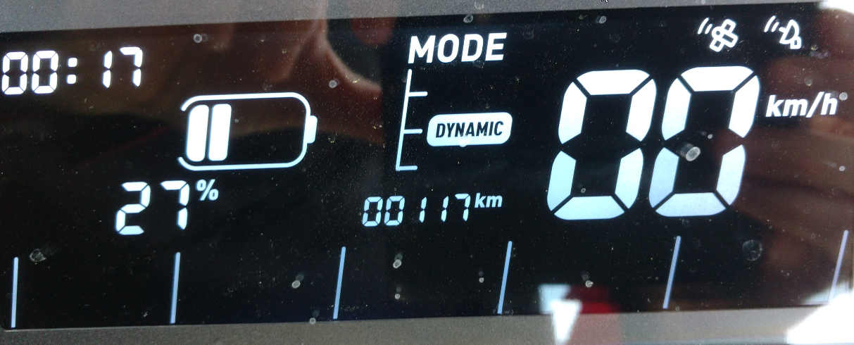 Was nicht ganz so lustig ist, wenn er das während der Fahrt macht. Man fährt an die 60km/h, Die Batterieleuchte wird rot, das Display resettet sich, der Modus wird auf Dynamic zurück gestellt, die Geschwindigkeit wird auf 47km/h zurückgedreht sehr uncool auf einer Kraftstraße. @NIU Hier sollte noch einmal die Firmware überprüft werden. Denn wenn der Kunde das erste Mal nach dem Kauf nach Hause fährt, darf das nicht passieren.