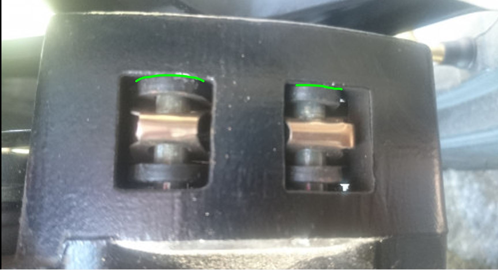 Ich denke halt, dass der Sattel nicht richtig sitzt. Dadurch liegt der innene Belag außen komplett auf Anschlag (grüner Bereich). Daraus resultiert, dass der innere Bereich des Belages immer von der Bremsscheibe weg gedrückt wird.
