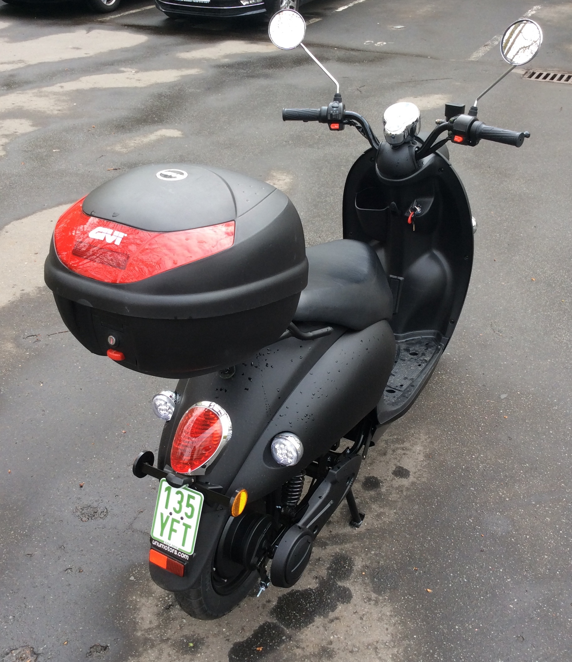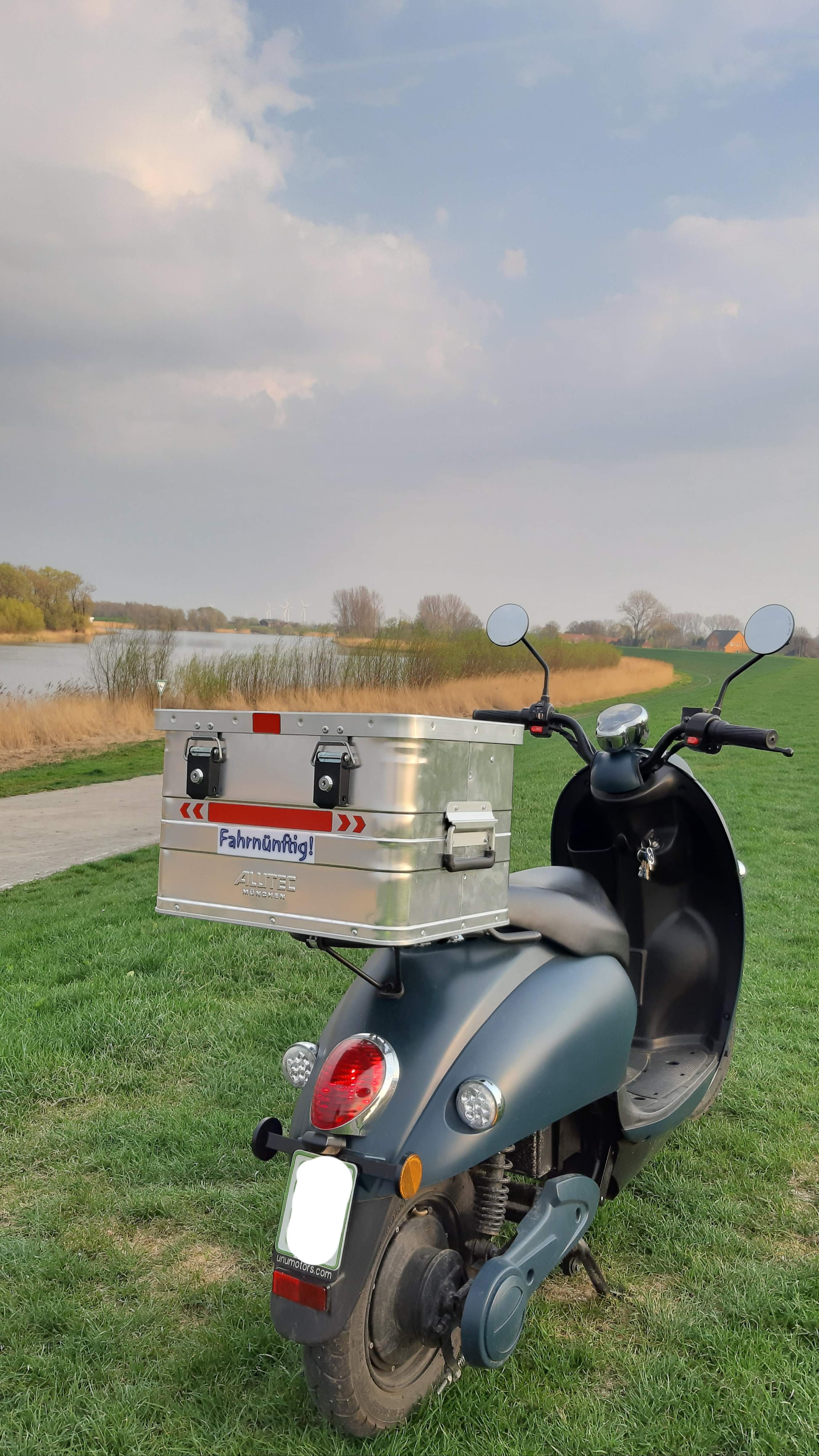 Die Topcases, die es zu kaufen gibt, gefielen mir allesamt nicht so richtig. Deshalb bin ich selbst kreativ geworden und habe eine eigene Lösung hergestellt. Mir schien die rustikale Optik einer 49l-Alubox am besten mit dem Retrodesign des unu zu harmonieren und es ich finde, das tut sie wirklich: Hier die Gesamtansicht von hinten.