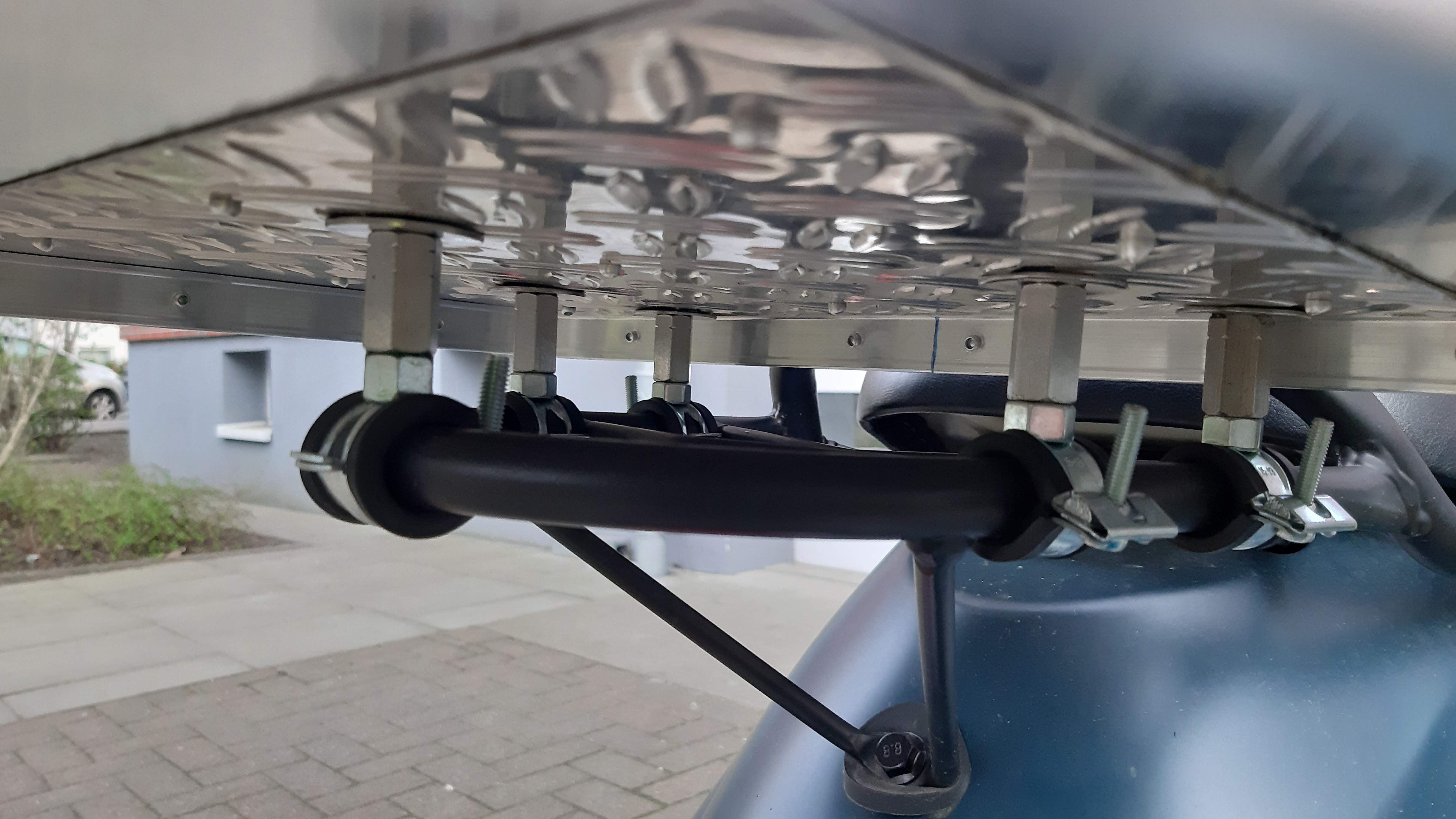 Die Box ist am Boden befestigt und derselbe oben wie unten mit je einem Alublech verstärkt. Zur Befestigung dienen 5 gepolsterte Rohrschellen der Größe 15mm - 19mm mit M8-Gewinde. Da hinein habe ich Gewindestäbe geschraubt und dabei mit hochfester Schraubensicherung (LiquiMoly grün) versehen. Die Distanz, um aus dem Falz, der über den Boden hinausragt, herauszukommen, habe ich Langmuttern von 23mm Länge verwendet. Auch die sind festgeklebt. Große Unterlegscheiben und ebenfalls hochfest gesicherte Hutmuttern halten die Kiste am Platz.