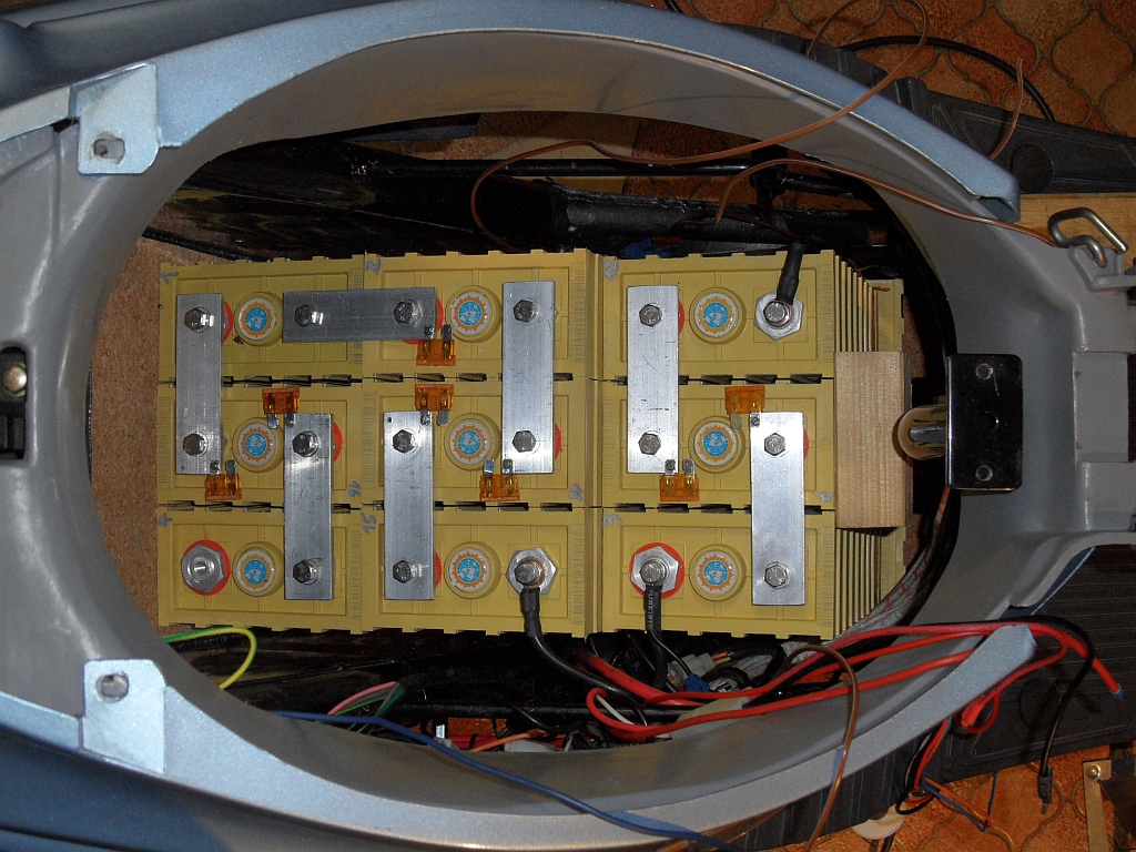 Die erste Lage ist eingebaut, die restlichen 6 passen gerade noch rein, das "Handschuhfach" unter der Sitzbank muß draußen bleiben.Wie man erkennen kann, wird nicht direkt an den Zellen balanciert, das DIY-BMS wird oben, gut zugänglich platziert.