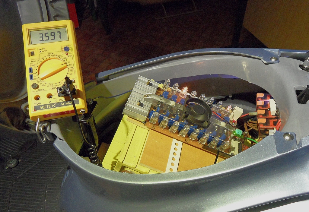 Im Chinakracher meiner Frau sieht es etwas aufgeräumter aus, trotzdem mußte ich mit einem Heißluftföhn Platz unterm Helmfach schaffen, um die 40er Akkus unterzukriegen.