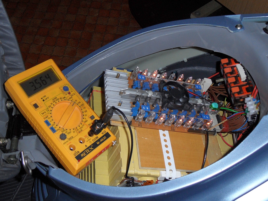 Endlich bin ich soweit, dass der Akku seine erste Vollladung bekommt. Man sieht schön, dass Zelle 6 als erste vollgeworden ist:Das Ladegerät wird in diesem Zustand von 8 auf ca. 1,2 A heruntergeregelt - die Birnen können ca. 1,4 A ableiten. Aus dem Wechselstromnetz werden dann nur noch ca. 200 W entnommen.