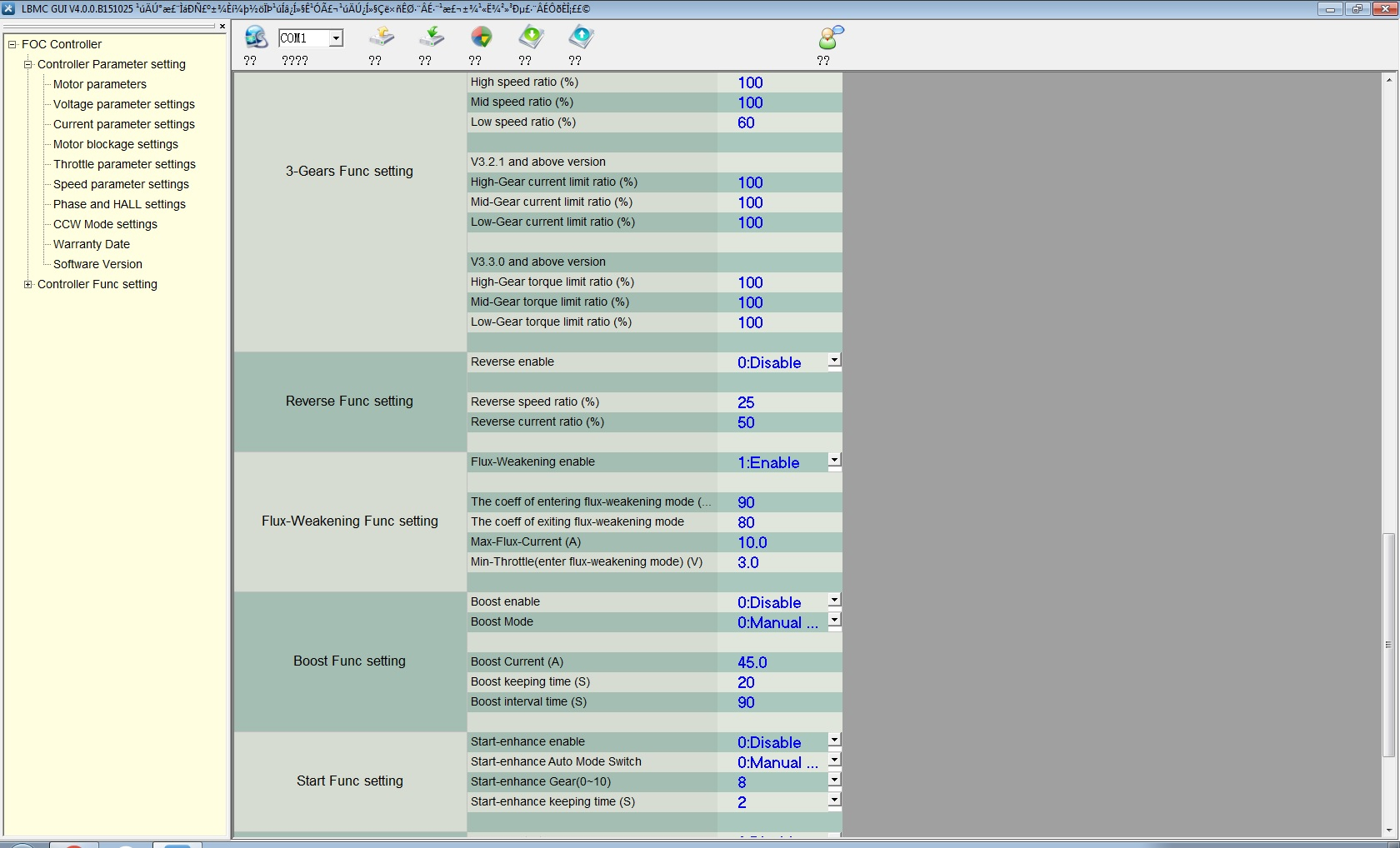 Ich habe speed limit disabeld, den max. Strom auf 140A eingestellt, den Anfahrstrom auf 18A, den Durchschnittstrom auf 44A.