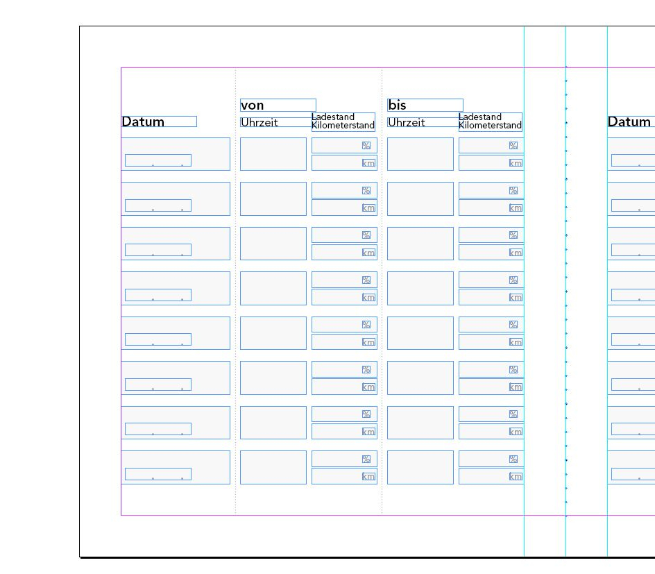 Ich bin gerade dabei eine Art Ladeprotokollvorlage in InDesign zu erstellen, da ich bisher immer meine Ladungen aufgeschrieben habe. Hintergedanke, ist dass ich mir irgendwann ausrechnen kann wie viel Strom das Ding gefressen hat.