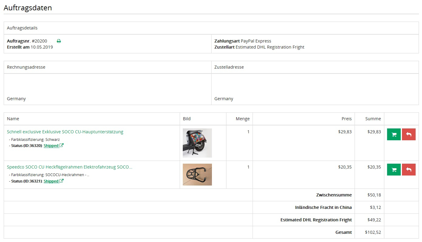 Nach der Auswahl meiner Artikel habe ich auch die Möglichkeit gewählt „Shipping Cost later“. Danach habe ich meine Artikel (insgesamt 50,18$) via PayPal bezahlt. Am selben Tag (10.05.2019) bekam ich die Aufforderung die Versandkosten in Höhe von 3,12$ zu bezahlen, was ich mit großer Freude via PayPal auch tat.