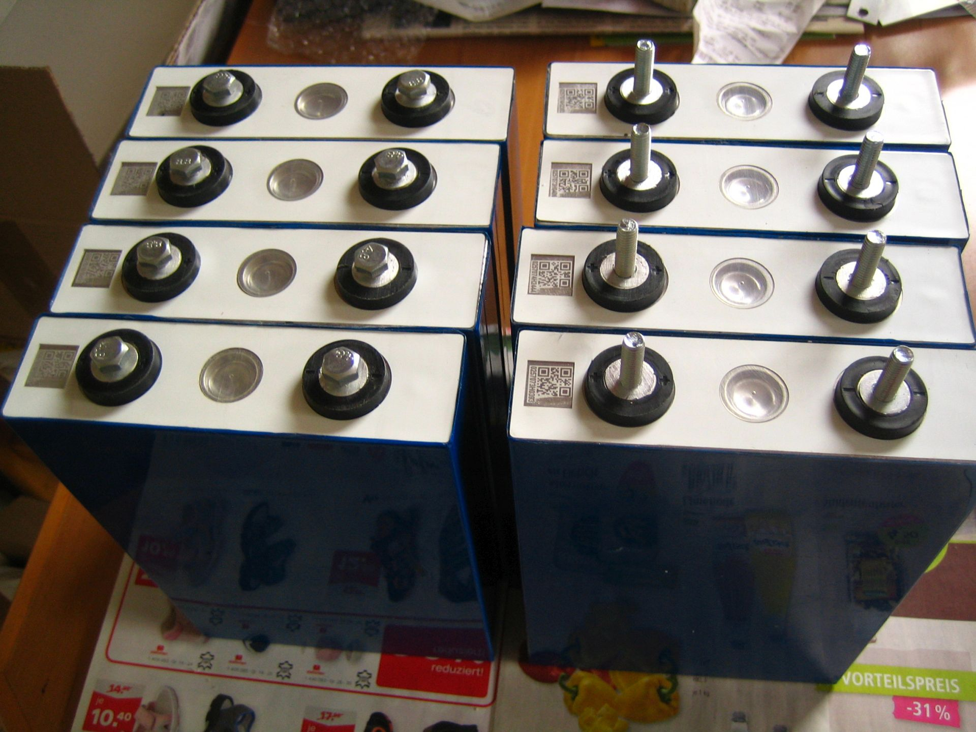 Im März schwächelte mein Greensaversatz 48V 60Ah C5. Darauf entschloß ich mich, 16 Stück 100Ah GTK LiFePo4 Zellen bei aliexpress zubestellen. Nach 8 Wochen Wartezeit - wegen Seefracht 2 * 16kg - war Anfang Juni der große Tag gekommen und UPS brachte 2 Pakete: Die Zellen sind hochkant und mehr oder minder einzeln verpackt.
