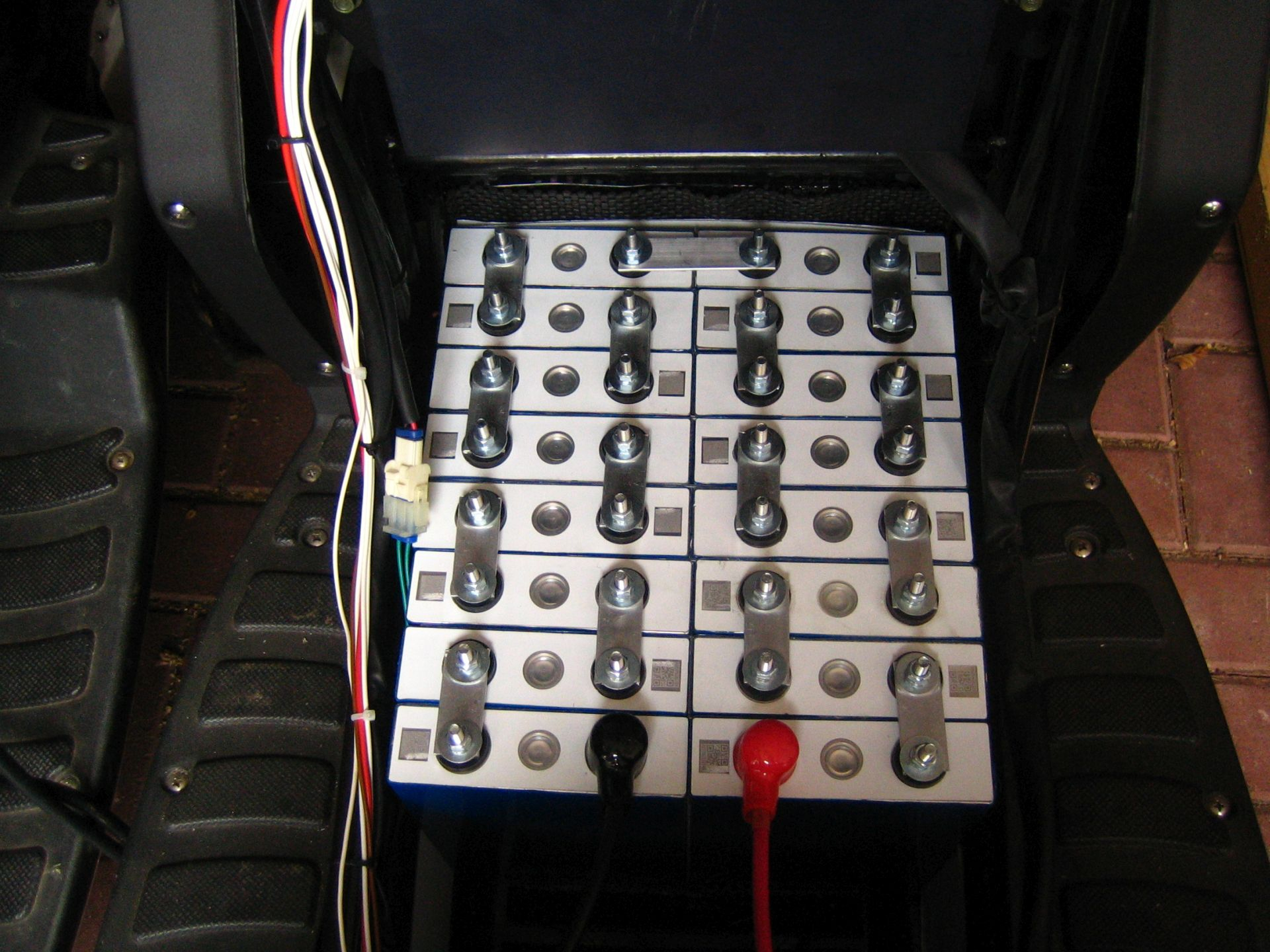 Ein Roller der gefahren wird, muß auch wieder geladen werden. Ich hatte noch ein 16-fach LiFePo4 Lastmodul, welches ich nunmehr montiert habe. Jede Akkuzelle hat ein Siegel mit Seriennummer - auf dieser Seite ist Plus. Die Ansprechschwelle beträgt 16 * 3,6V = 57,6. Die maximale Ladespanung sollte 0,8..1,6V niedriger sein.