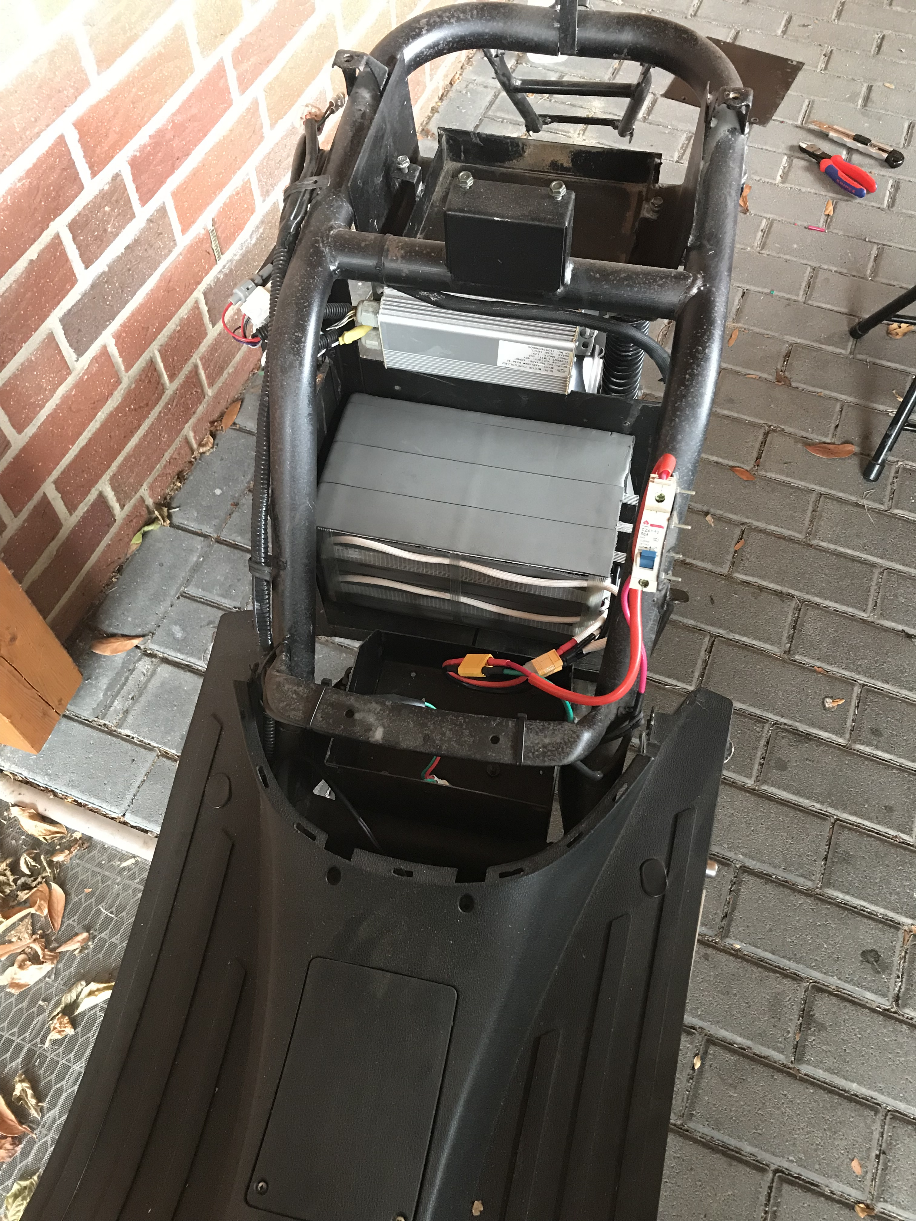 Er hat nur rund 600km gelaufen. Die 4 schweren Bleigel Akkus habe ich ausgebaut. Es ist nun genug Platz für den neuen Li-Ion Akku den ich selber baue. Es wird ein 40Ah 14S Akku aus 224x Original Samsung 25R Zellen. Das sind Hochstromzellen und eigentlich ziemlich unterfordert in dem Roller, aber so bleibt der Antrieb durchzugsstark bis zum Ende der Ladung und der Akku hat durch die grosse Reserve eine lange Lebenszeit.