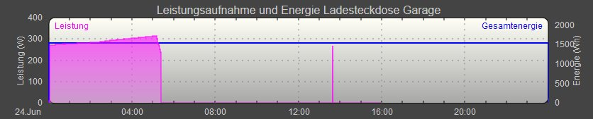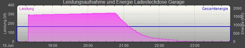 Die Ladeleistung wird offenbar durch den Ladestrom begrenzt. Ein leerer Akku hat eine geringere Zellspannung, demzufolge wird weniger Leistung abgezogen. Die (hier primär gemessene) Ladeleistung beginnt bei einem leeren Akku bei mir bei ca. 270W und steigert sich bis kurz vor dem Knick auf 311 W. Die abklingende Ladephase dauert etwas mehr als 1,5h, bevor offenbar der Akku (nach dem vorigen Erkenntnissen) im Bild um 22:30 Uhr den Ladevorgang abrupt beendet. Der blaue Strich markiert nur die Tagesgesamtenergiemenge, hier ca 950 Wh.