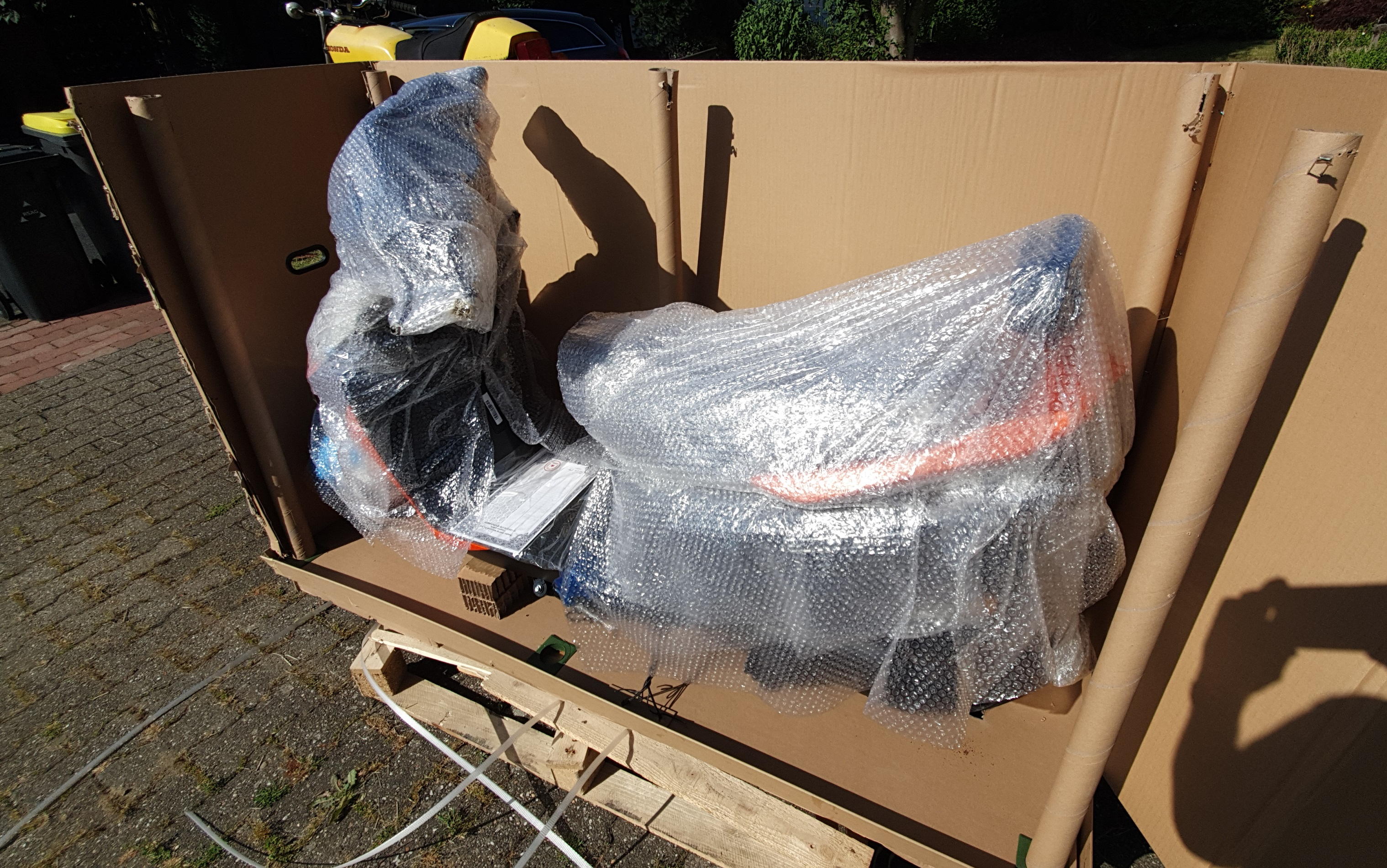 . Laut Spedition sollte der Roller zwischen 09:00Uhr und 14:00Uhr geliefert werden, kam dann fast überpünklich um 09:13Uhr an was mich sehr gefreut hat denn somit hatte ich genug Zeit den Roller auszupacken und und den neunen Akku zu laden.