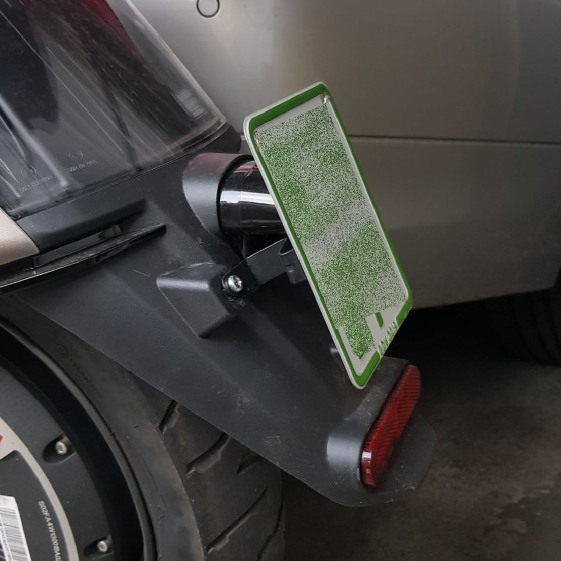 Nachdem durch den Gepäckträger die Winkellösung unter dem silbernen Haltegriff hinten wieder wegfiel, musste ich das spontan neu lösen (an einem Sonntagnachmittag unter Zeitdruck). Ich hatte eh die Idee, den ohnhin nicht erforderlichen Kennzeichenbeleuchter einfach zu überdecken: