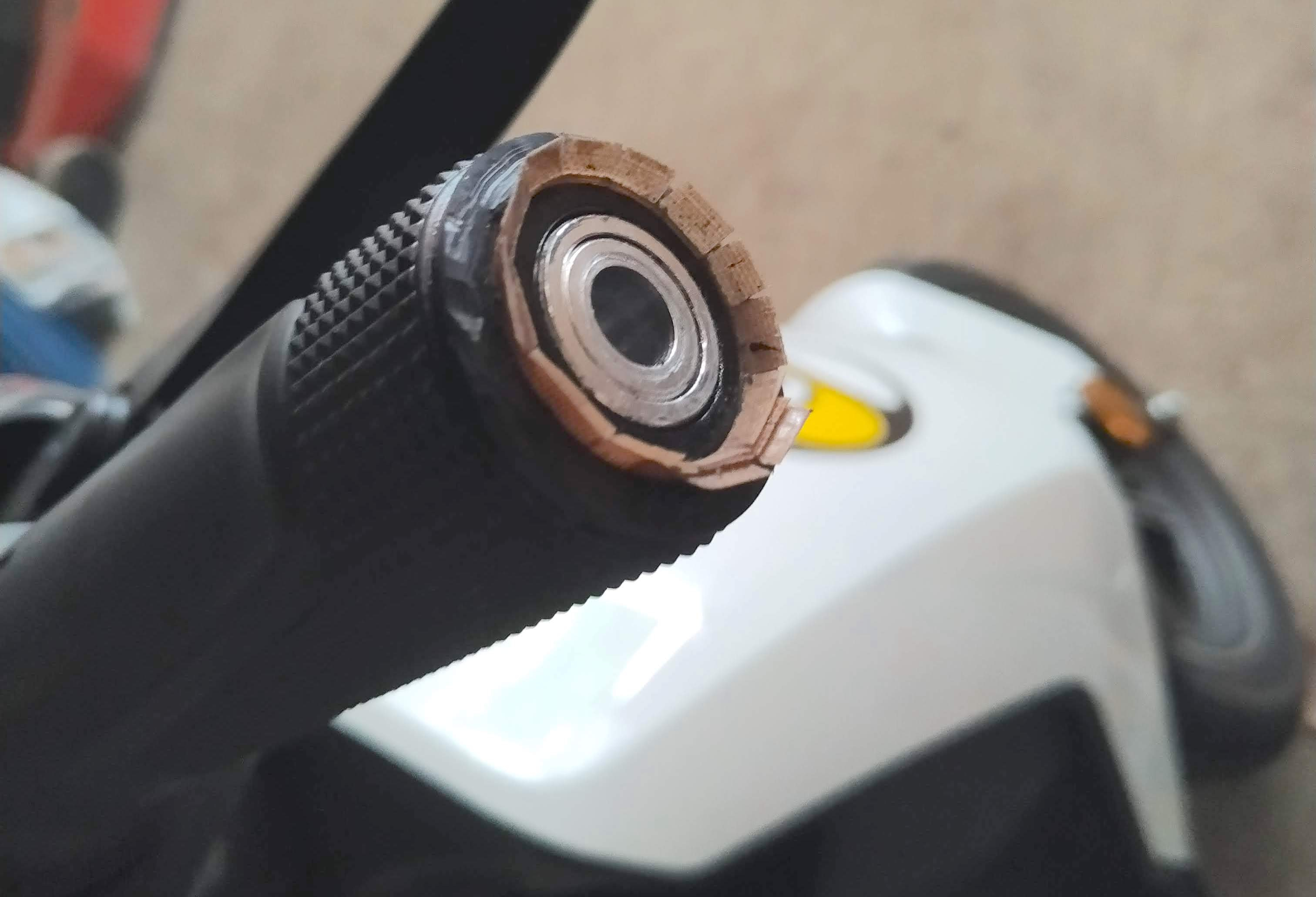 Ich hatte ja schon bei "Umbauten/Zubehör" über die günstigen Alu Lenkerenden berichtet, die das schon etwas stabilisieren, aber ja dem Stromgriff nicht den komplett umlaufenden Millimeter an Spiel nehmen.