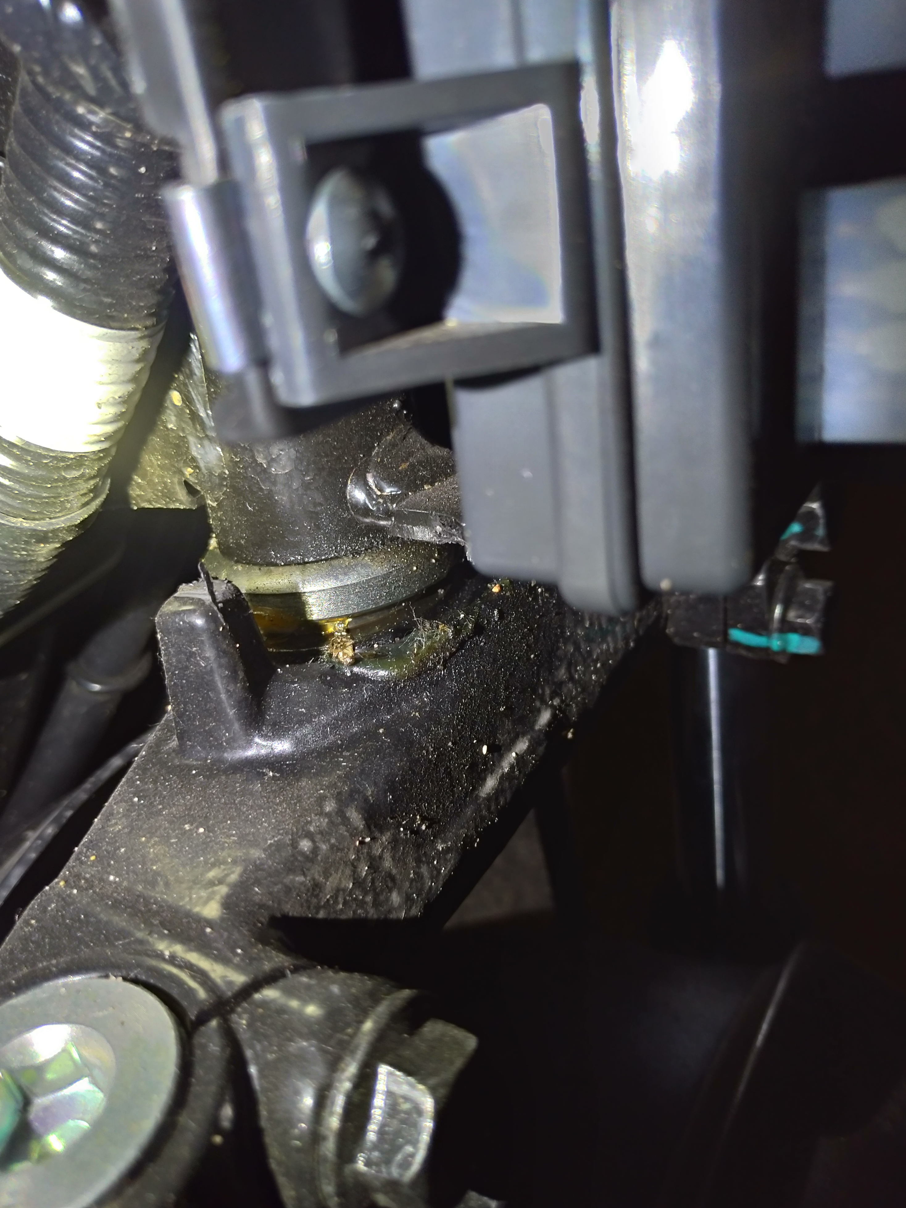 Da habe ich dann mal die Frontverkleidung abgeschraubt. Man kann recht gut erkennen das sich die Gabel vom Steuerrohr leicht getrennt hat bzw. sich seitlich ein wenig raus gezogen hat.