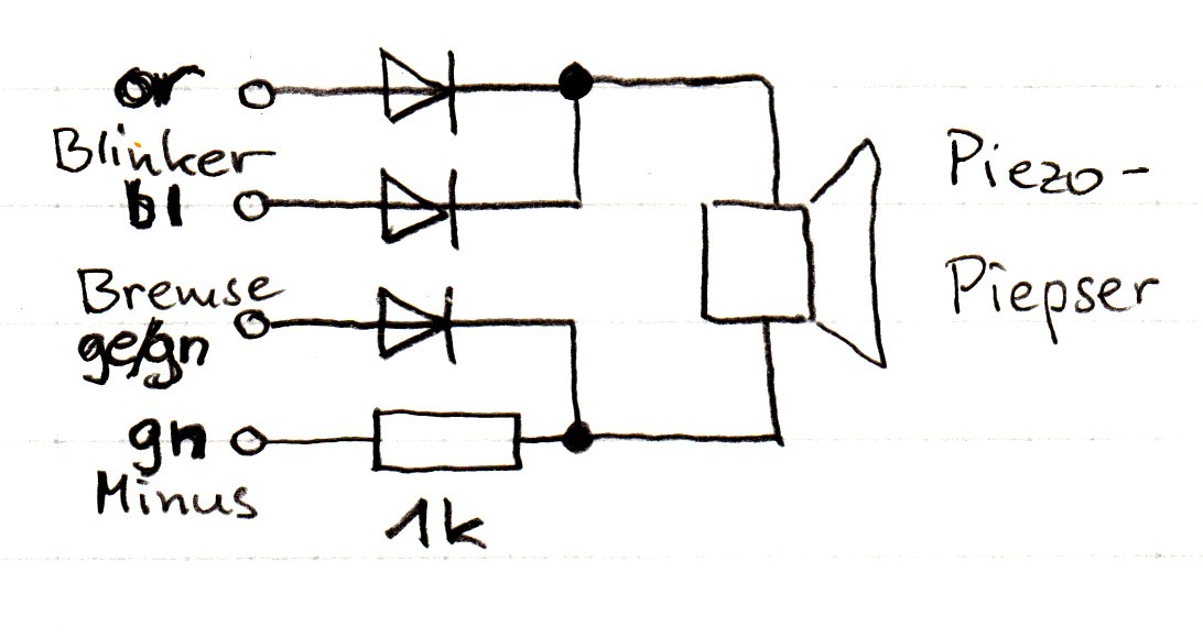 Geht tatsächlich einfach mit zusätzlich einem Widerstand und einer Diode: Der Piepser piepst synchron zum Blinker, er ist etwas geräuschgedämmt durch den Widerstand, macht aber nichts. Wird die Bremse betätigt, gelangt deren Versorgungsspannung ebenfalls auf den Widerstand - somit gibt es für den Piepser keine Spannungsdifferenz mehr und er bleibt stumm. Beim Bremsen vor der Ampel und im Stand mit gezogenem Bremsgriff passiert also nichts, egal wie lange die Rotphase ist. Sobald ich losfahre, piepst es wieder und macht parallel laufende Fußgänger und Radfahrer auf mich aufmerksam. Für mich ist das optimal...Pfriemler hat geschrieben: Mi 26. Jun 2019, 22:11 2) Bremslicht als "Fußpunkt" war ja als Option gedacht, durch Ziehen der Bremse den Piepser zu deaktivieren. Prinzipiell funktioniert das - aber leider sind die LEDs sehr effizient - schon 1 mA erzeugt ein deutlich sichtbares Mitblinken der separaten Bremslicht-LEDs (auf den Leisten sieht man es nicht). Klappt also so nicht, aber ich vermute, dass schon ein gut dimensionierter Zusatzwiderstand als Last das Spektakel beendet... Oder ... Transistor... oder ... 4093 ...