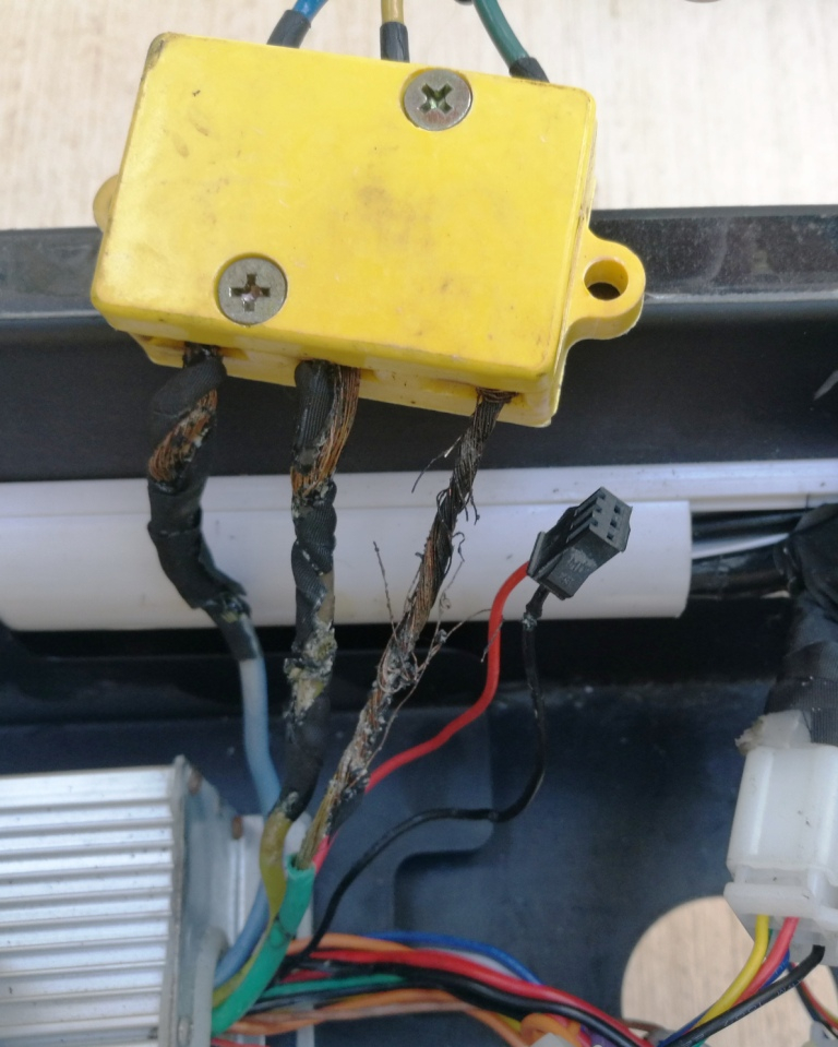 2. habe ich beim Abbauen das Stromkabel des Nabenmotors ausgebaut. Beim Öffnen der Abdeckung vor dem Batteriefach stellte ich fest, dass es einen massiven Kabelbrand (offensichtlich mit grösserer Hitze-Vermutung) an verschiedensten Kabeln gegeben hat. Selbst Stecker sind an- und zusammengeschmort. Ein Wunder, dass der Roller überhaupt noch lief???