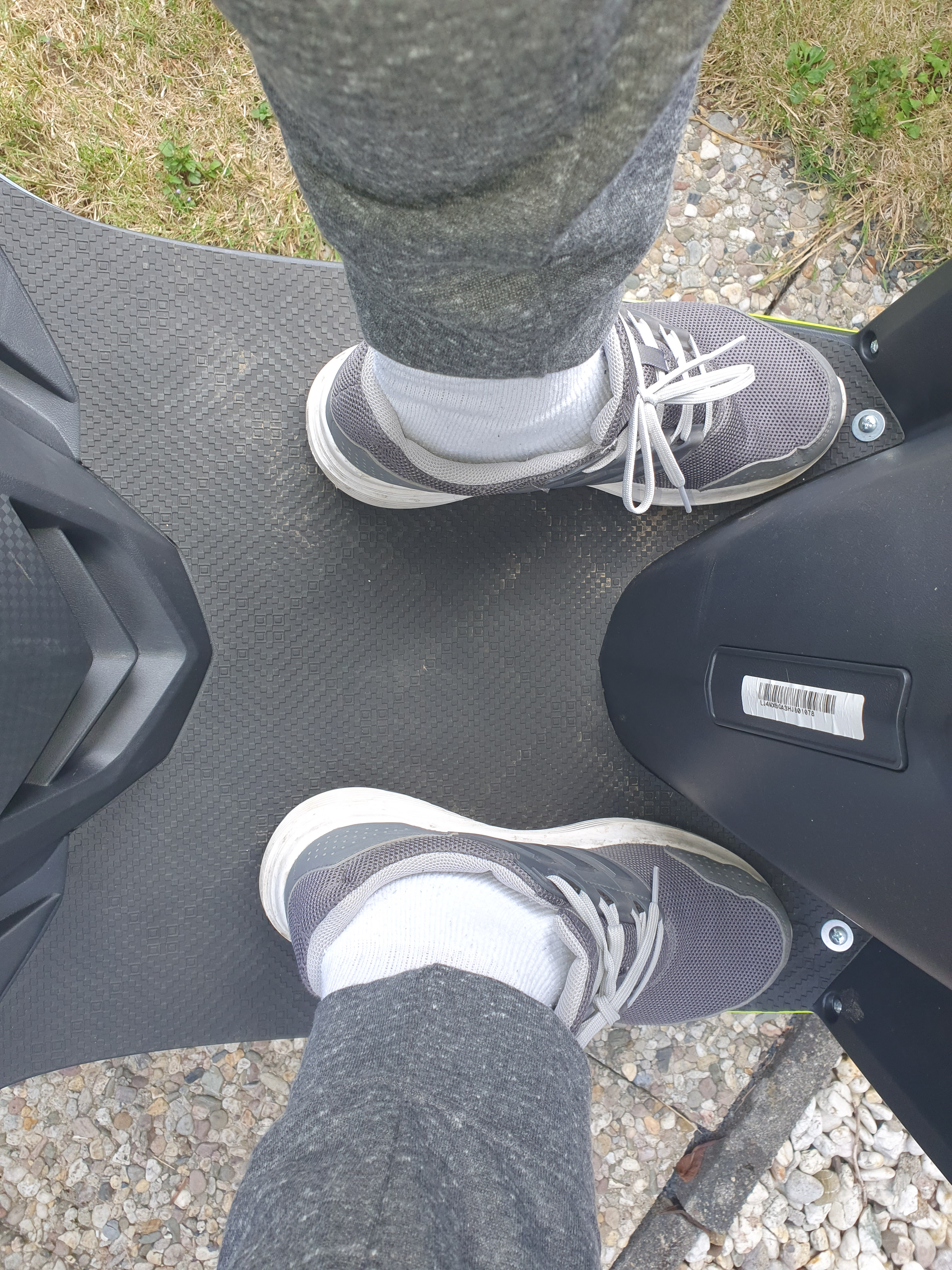 Ich meinte, ob du mit den Füßen flach auf die Straße, seitlich vom Roller, kommst, wenn du auf der Sitzbank sitzt.
