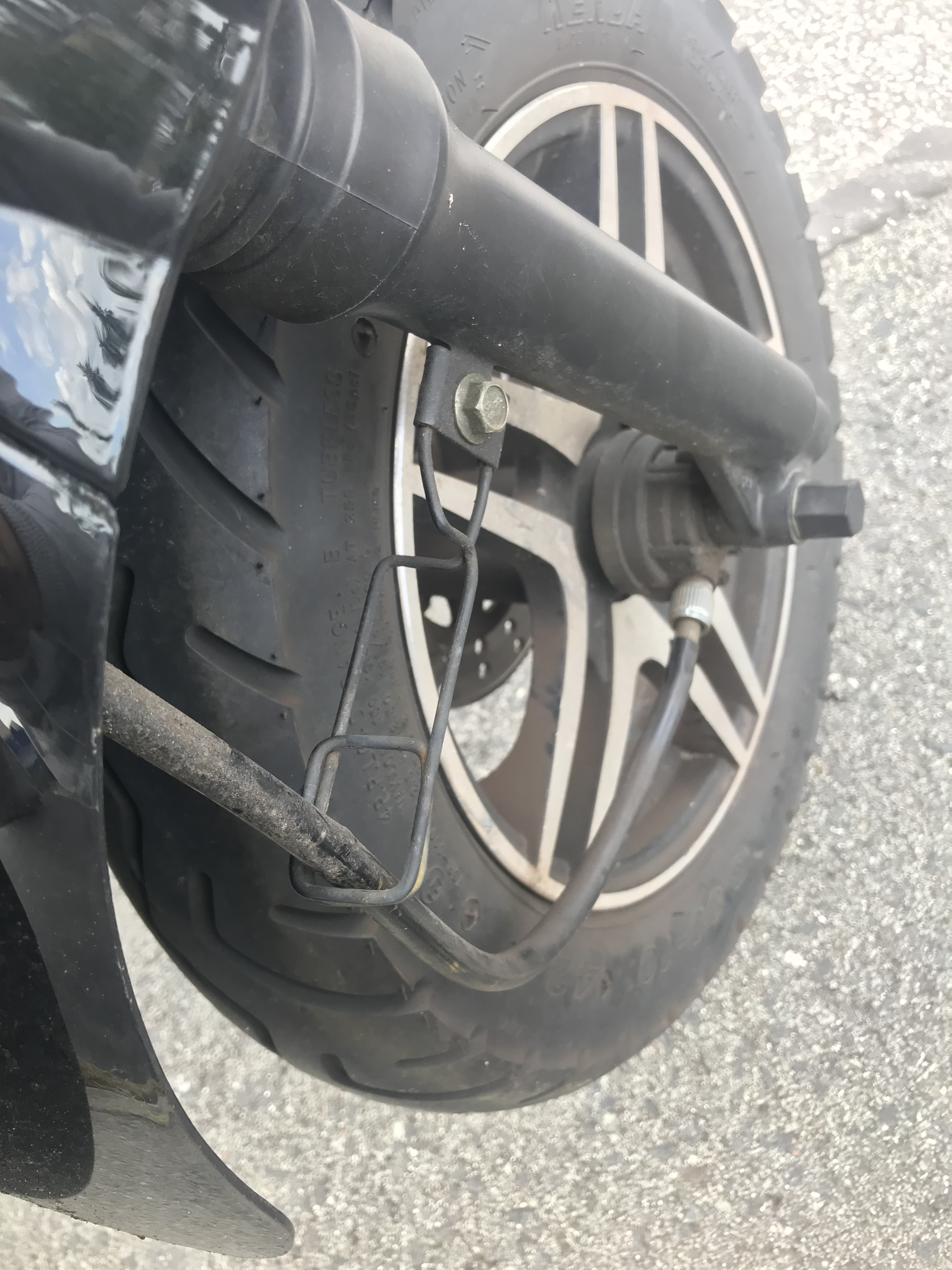 Mittlerweile hatte ich die Ehre neben einem anderen Unu meiner Generation zu parken. Die Halterung für die Tachowelle sieht in der Tat sehr ähnlich aus - und bei Bedarf kann man ja hin- und herbiegen. An der Bremse ist von hinten aus eine kleine Spur zu sehen, der Roller verhält sich aber normal, beim Fahren wie beim Bremsen. Auch sieht da nichts "schief" aus.
