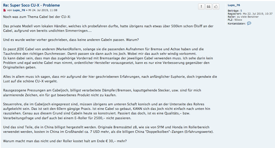 ein Tipp und ich rufe jeden Vmoto-Geschädigten dazu auf, seine Erfahrungswerte mit der Soco auf der fb-Seite des Herstellers kund zu tun, das könnte eventuell auch weiterhelfen...Allgäuer hat geschrieben: Di 23. Jul 2019, 22:20 Ich habe auch schon mit meinem Anwalt darüber gesprochen. Es war eine große Fehlentscheidung mit der super soco. Hier liegt meiner Ansicht das Recht auf einer Seite.