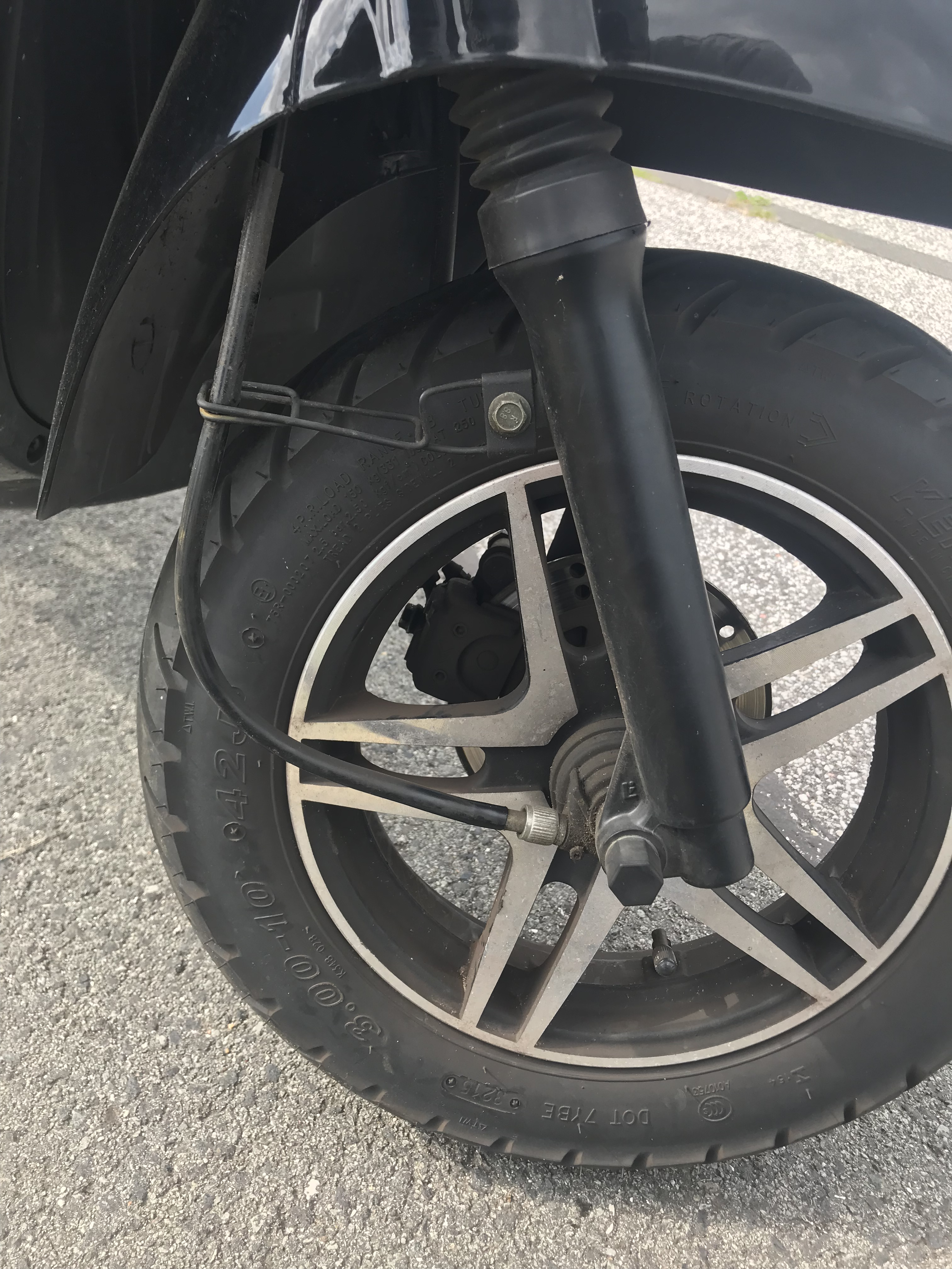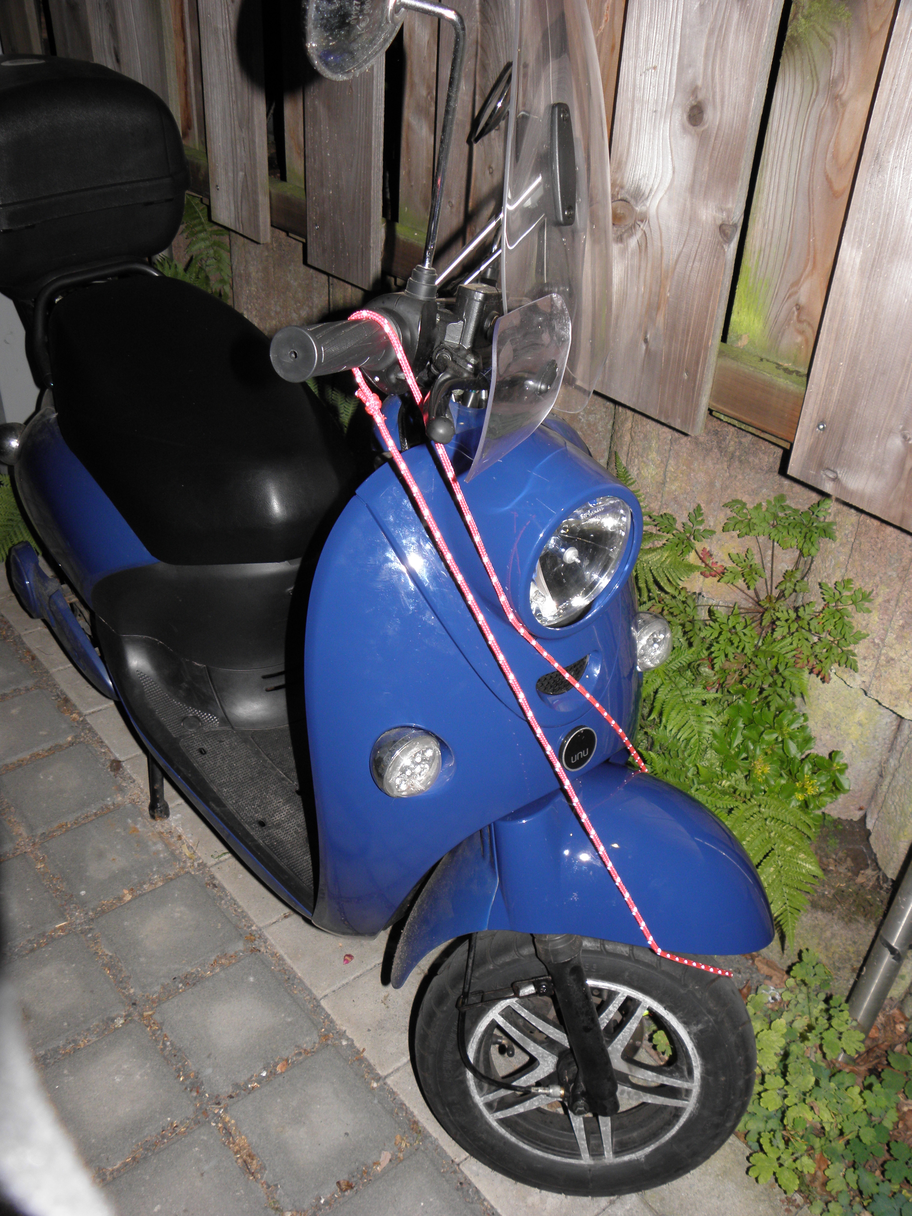 Mittlerweile hatte ich die Ehre neben einem anderen Unu meiner Generation zu parken. Die Halterung für die Tachowelle sieht in der Tat sehr ähnlich aus - und bei Bedarf kann man ja hin- und herbiegen. An der Bremse ist von hinten aus eine kleine Spur zu sehen, der Roller verhält sich aber normal, beim Fahren wie beim Bremsen. Auch sieht da nichts "schief" aus.