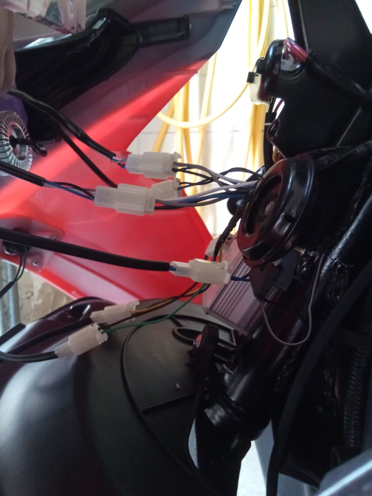 Habe oben die beiden Schrauben unterhalb des Lenkers gelöst und die Abdeckung vorsichtig nach unten geschoben. Nun sehe ich die große silberne Handschraube der Lichteinheit die ich auch noch abgedreht habe.