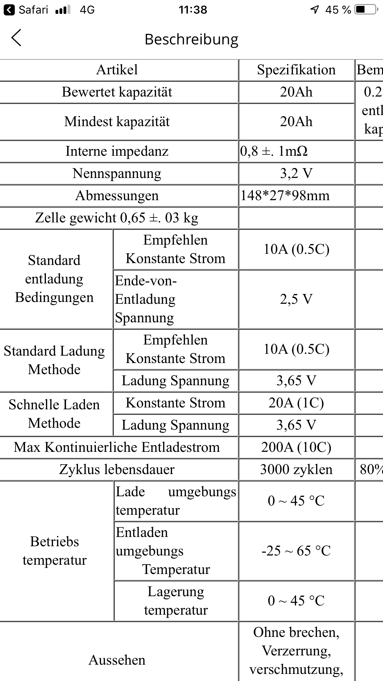 In den Daten schreibt der Anbieter zu den 20Ah Calb: "Kontinuierliche Entladung 10C" Das wären 200A! Ich denke eher, dass es sich um einen max. Kurzzeitentladungsstrom handelt. 42A dürften aber kein Problem darstellen. Die Calb gibt es derzeit bei Aliexpress für 20 USD/ Stück.