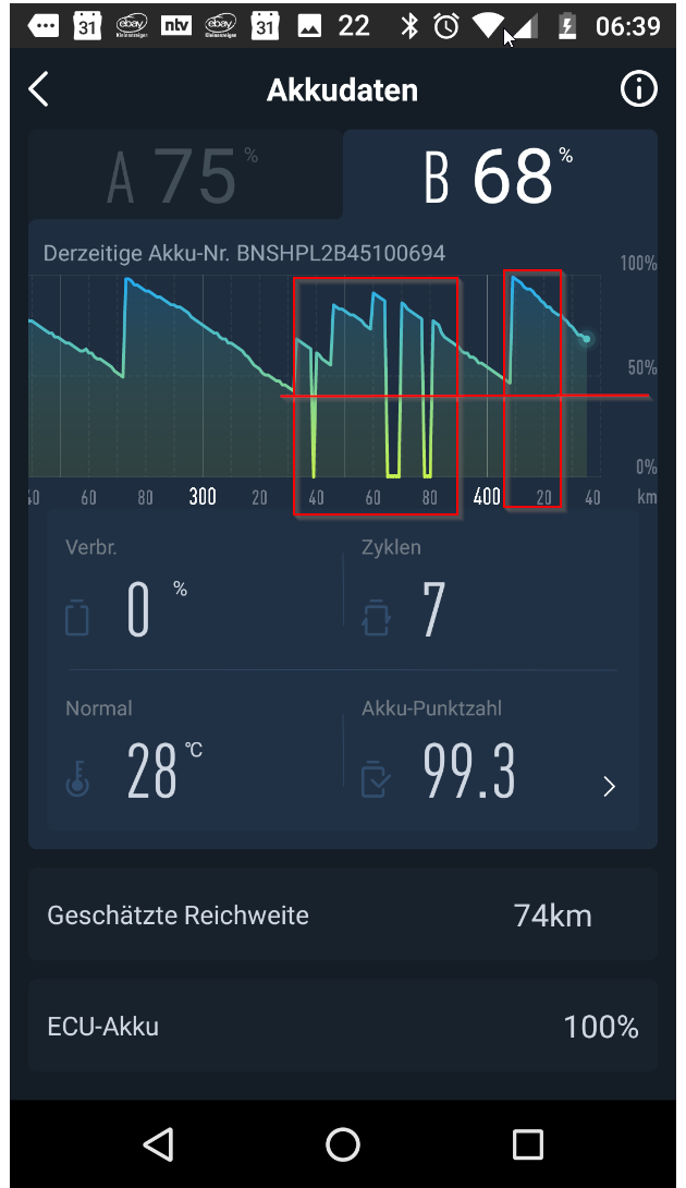 Die Einbrüche auf dem 68% Akku kamen, weil ich versucht hatte nur mit einem Akku zu fahren um die Werte anzugleichen. Das hatte nicht funktioniert. Der Roller wollte wieder die Differenz haben.