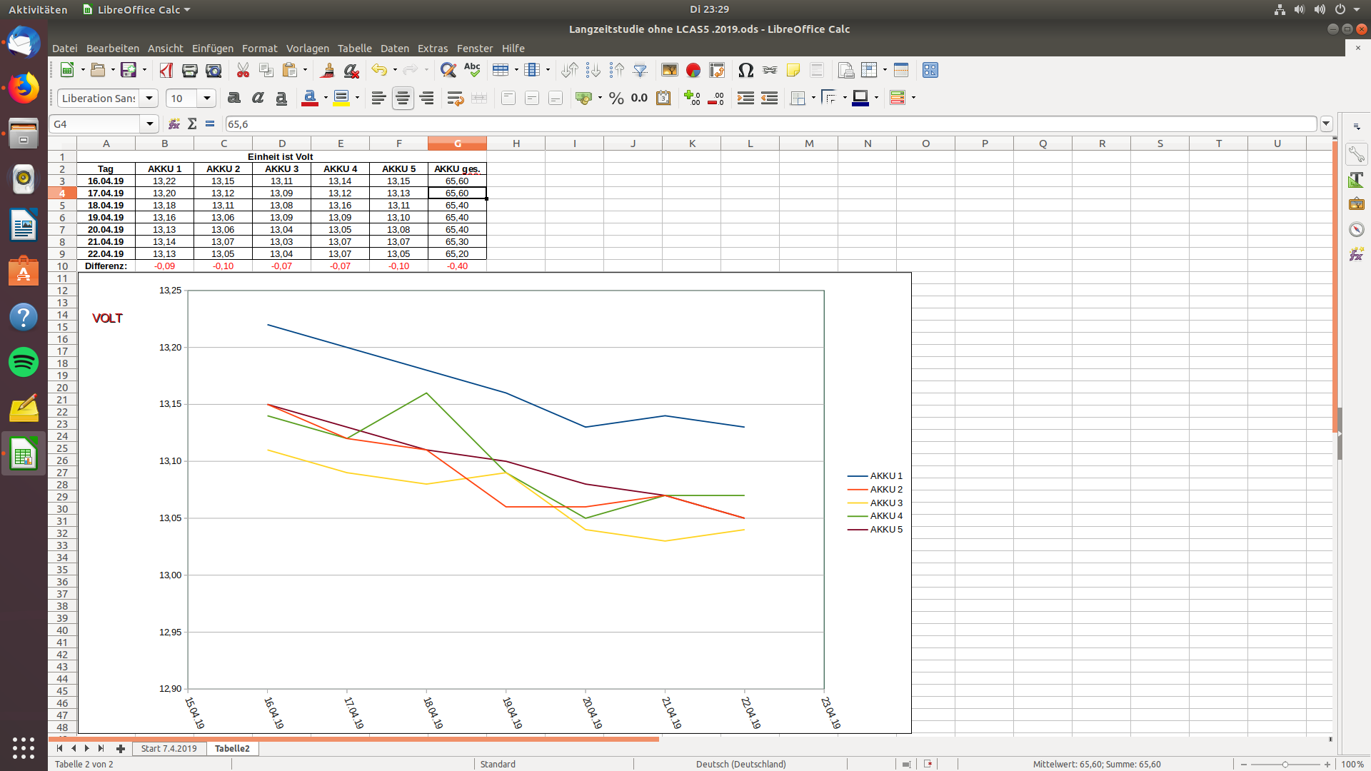 nun habe ich auch den HA02 an die Testakkus angeschlossen und nach Vollladung jeden Tag, eine Woche lang die Spannung gemessen und dokumentiert.