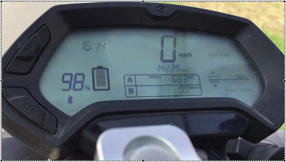 Hier grafisch aufgetragen: Es ist aus einer Videoaufnahme des Tachos entstanden, der einerseits sehr genau ist (max +1%) und andererseits auch extrem schnell reagiert. Startpunkt 0 ist das Videobild, bevor der Stapel "Torque"-Balken ganz rechts im Display erste Anzeichen des Aufbaus zeigt. Hier ein Screencapture des Nullpunkts: Und hier 0,233s später der sich schon aufbauende Balken ganz rechts: Ein Augenblick später war der Balken ganz aufgebaut und die Fuhre mit mir drauf (Kampfgewicht 105kg) schon 3km/h schnell: Gefahren bin ich einmal hin und einmal zurück, und die Zeiten sind aus beiden Läufen gemittelt, um leichte Höhenunterschiede und den leichten Wind auszugleichen.