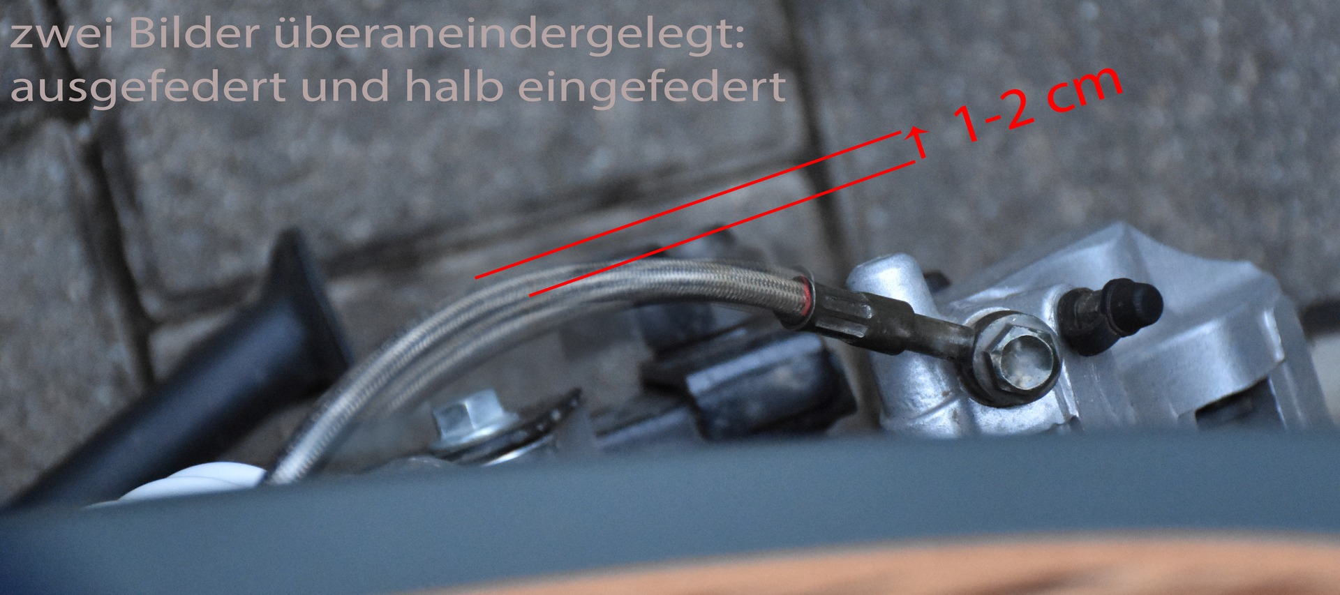 die Leitung nicht in Fahrtrichtung von der Bremse wegführen, sondern um 20° nach außen (mit Schraubschlüssel leicht lockern, drehen, wieder anziehen) -siehe Bild von oben: