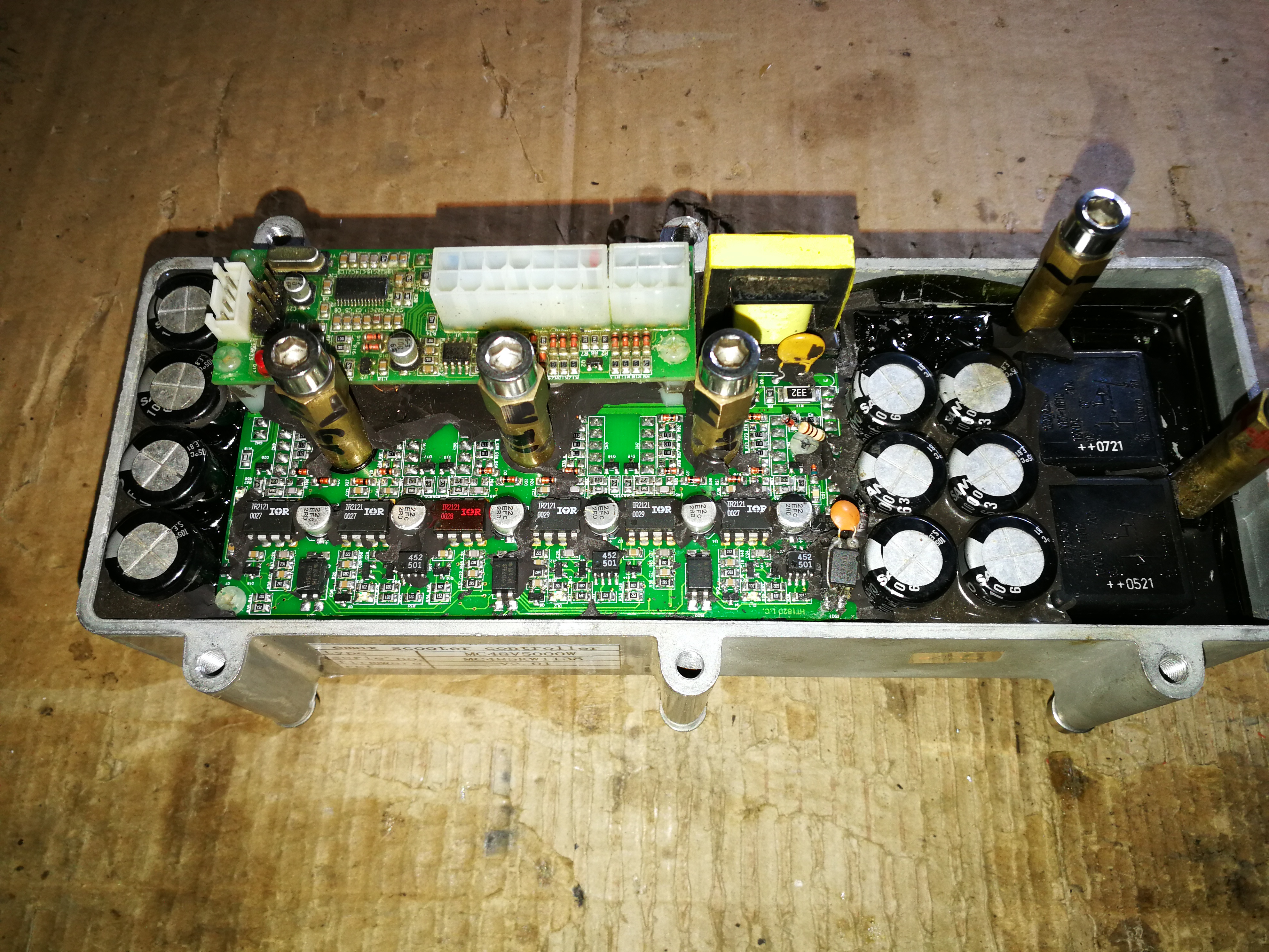 Ich habe festgestellt, dass man die obere Gummischicht am Controller abhebeln kann, um an die Mosfet Treiberplatine zu kommen und dort musste ich beim messen an einem Treiber feststellen, dass ein Mosfet durchgebrannt ist -> übrigens der Mosfet, bei dem auch die Spule verkokelt war. Nun ist es so, dass unter der weicher Vergussmaße eine harte (dort sitzen auch die Mosfets) kommt was eine Reparatur leider unmöglich macht