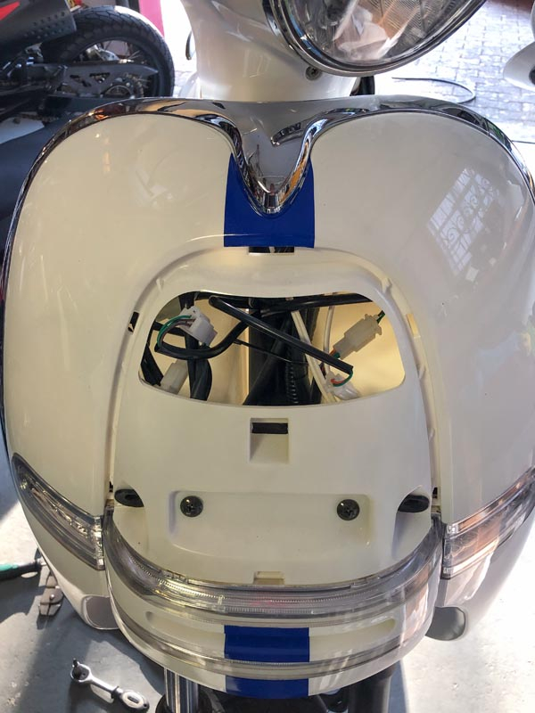 In diesem Zusammenhang fand sich auch eine 'Revisionsöffnung' vorne am Roller, die nur gesteckt ist und einfach abziehbar ist. Die Verkleidung als solche bekommt man *nicht* ab. Oder nur, wenn man den kompletten und ganzen Roller von Hinten nach Vorn (in dieser Reihenfolge) auseinander nimmt. Die seitlichen Chromleisten (mit Haltefunktion) werden diese Demontage nicht überstehen. Die sind ultrakompliziert geklipst und (versteckt) verschraubt.