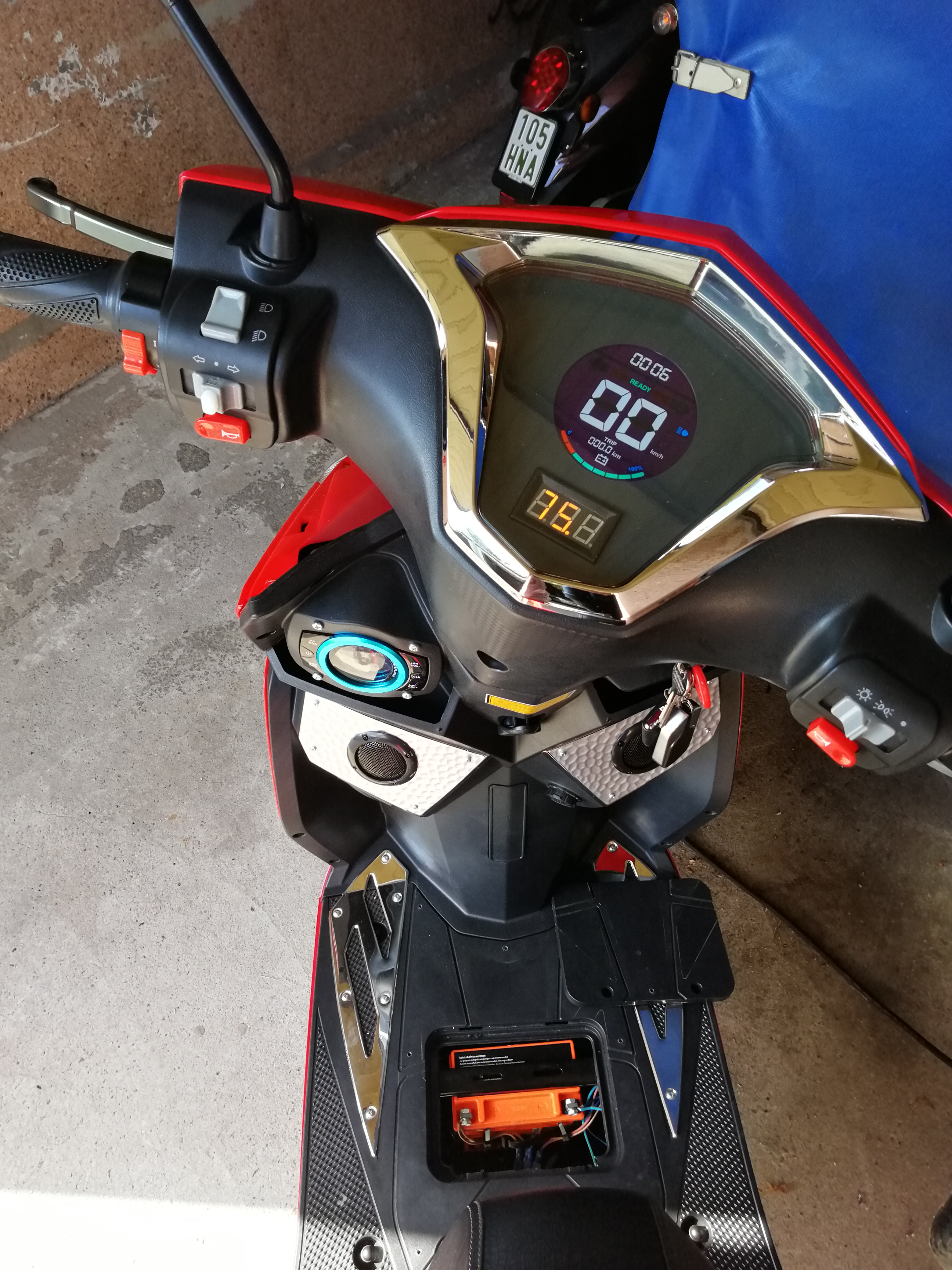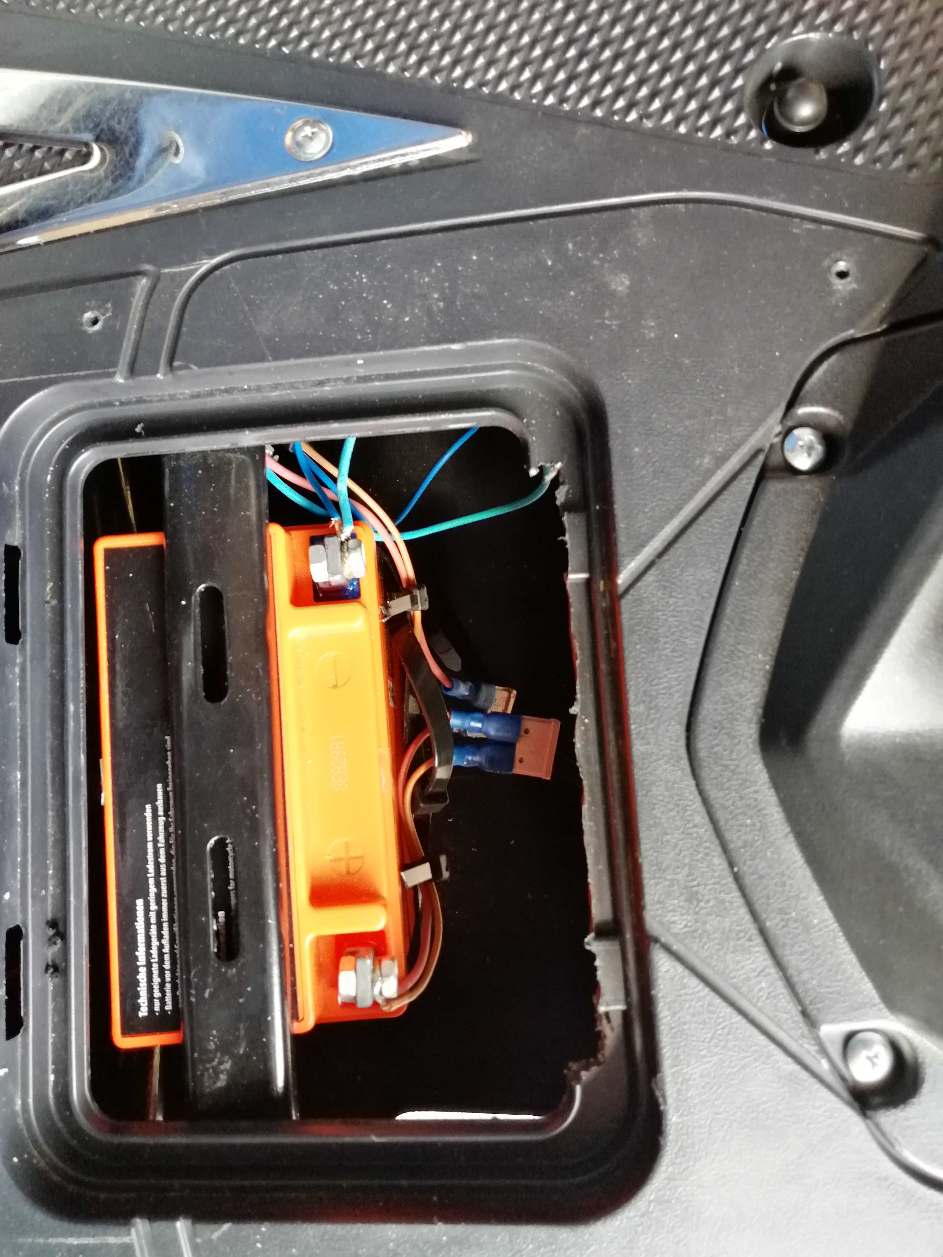 Hallo, Media Center űber eBay gesucht und auch bekommen. Wurde sofort eingebaut und geht super. Das Gerät mit langen Schrauben und einer Platte befestigt, passt in den original Platz. Stromversorgung űber eine 12volt Batterie, Platz im Boden. Geladen wird űber neuen Stecker unter der Sitzbank. An diesem kann ich die Batterie kontrollieren und laden, ohne den Boden zu öffnen, unter der die Batterie ist. Somit wird die Batterie zum Fahren nicht belastet und ich habe keine einbuße in der Reichweite.