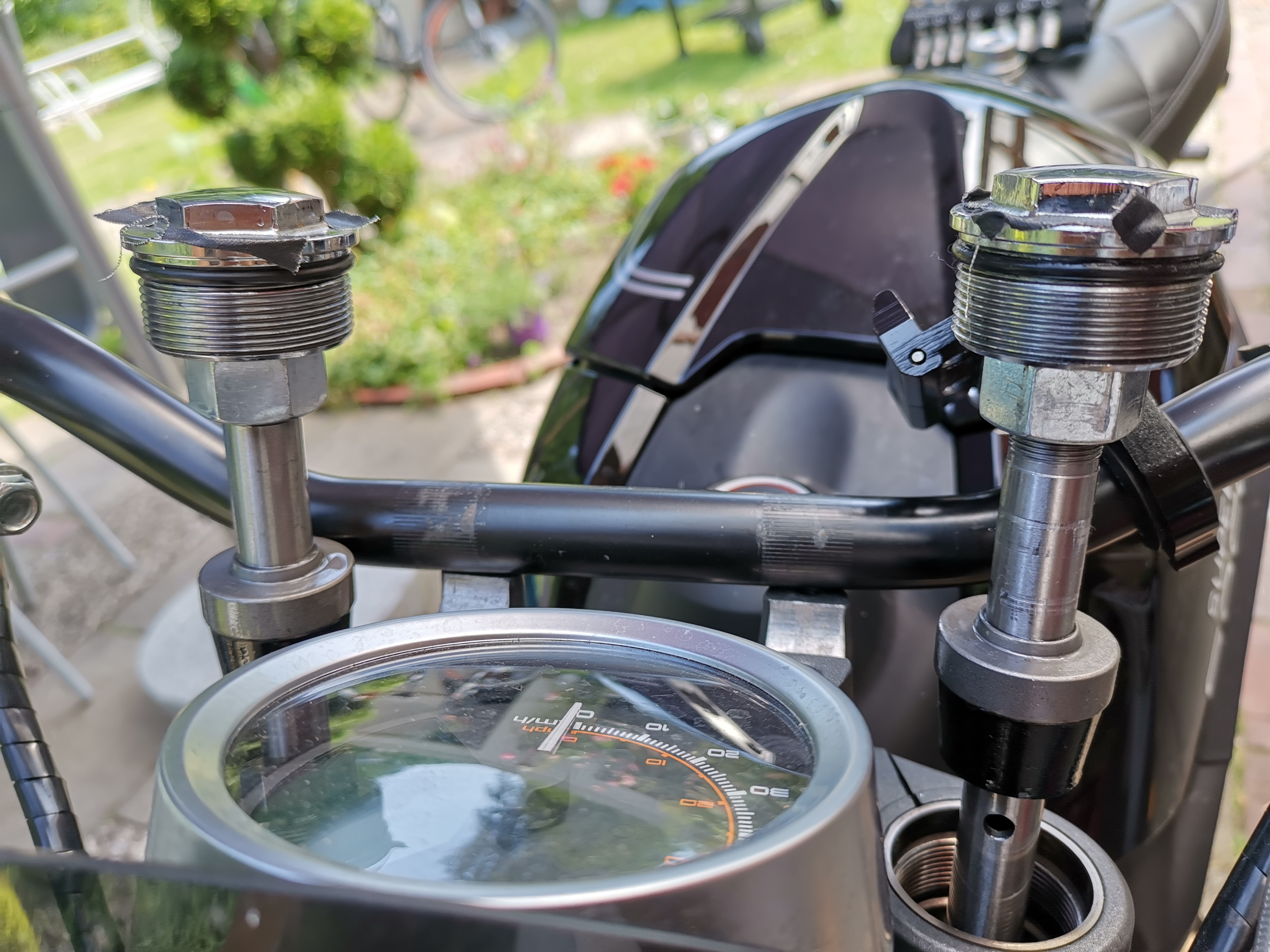 Grund für das durchschlagen wird der zweite montierte Akku und meine flache Sitzposition durch Superbike Lenker sein die mehr Gewicht aufs Vorderrad bringt. Zum auffüllen habe ich einfaches Motoröl genommen.