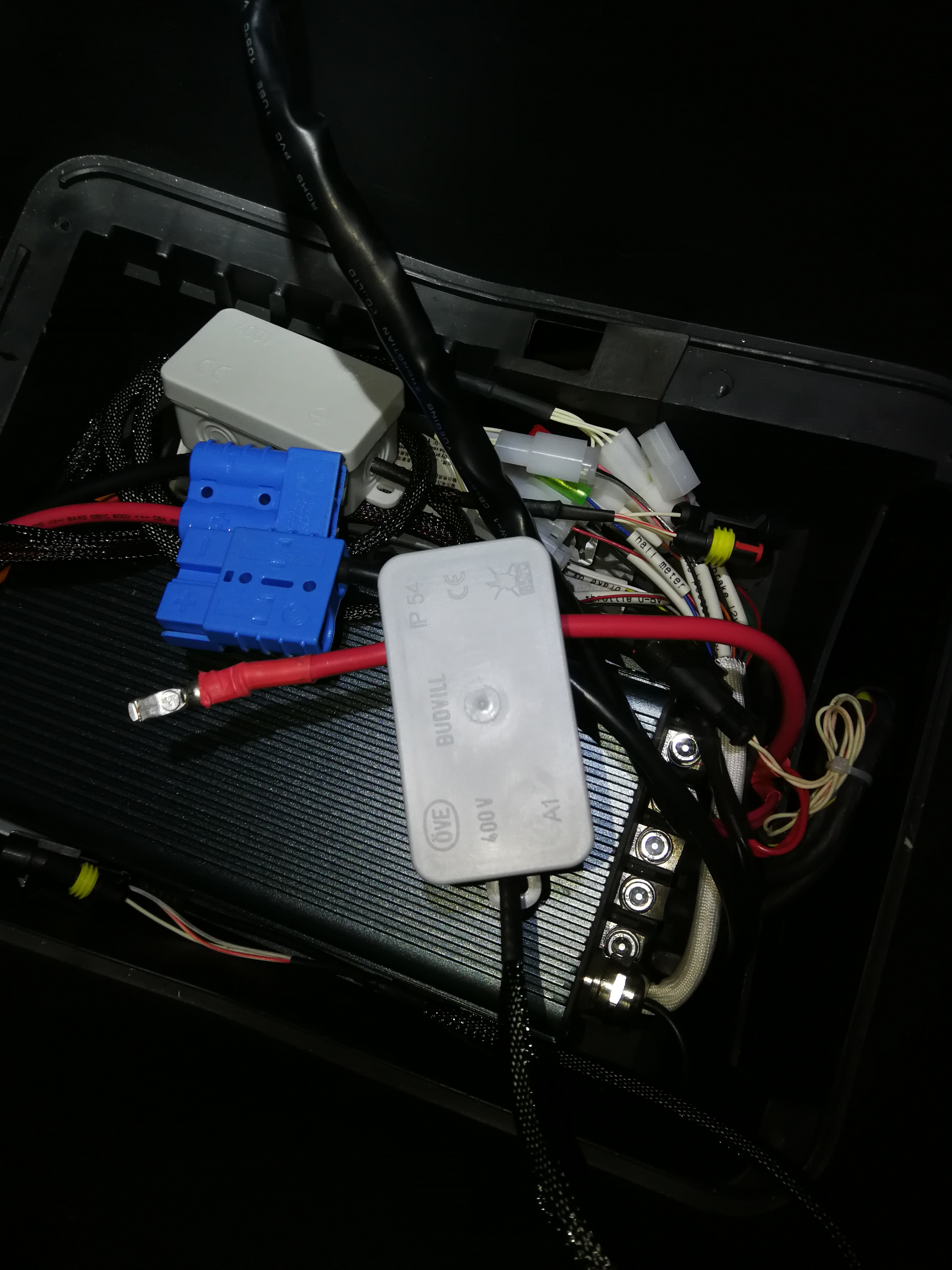 Ich habe vom defekten Controller den Originalstecker ausgelötet und mit dem Sabvoton Steckern passend verlötet. Zwischendrin habe ich noch eine kleine Abzweigdose mit einem DC/DC Wandler für die 12V mit eingebaut:
