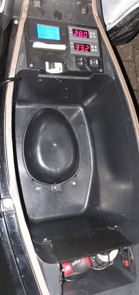 9. überarbeitung des "orig Batteriefach" mit Sicherungsautomaten, 230V Multimeter, 2x Temperaturrehelung (Controller Kühlen, Akku Heizen), Sicherung 12V, USB Buchse für Controller, 230V Schalter für jedes Ladegerät