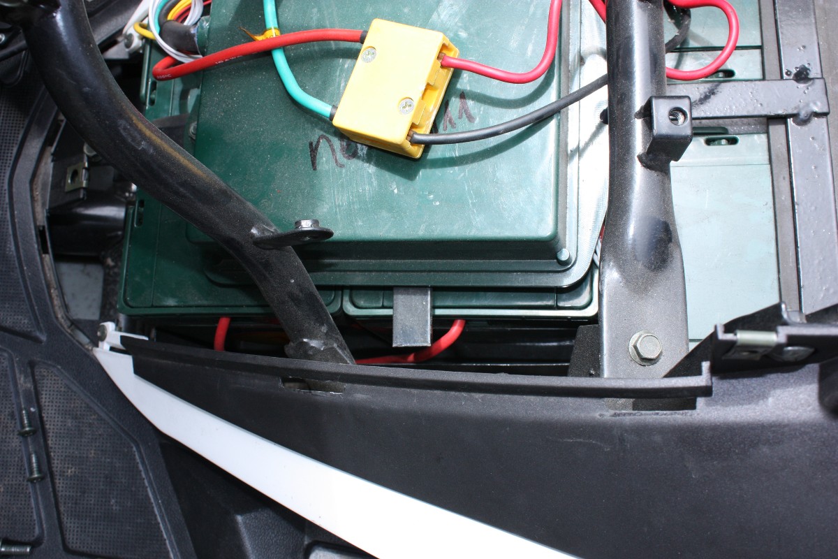 Ich hab vorhin mal den Roller so weit entkleidet, dass ich vernünftig an die vorderen Akkublöcke heran kam. Das war weniger schlimm als ich dachte, die Verkleidungsschürze vorn am Sitz lässt sich doch recht einfach abnehmen. Hier mal zwei Bilder: