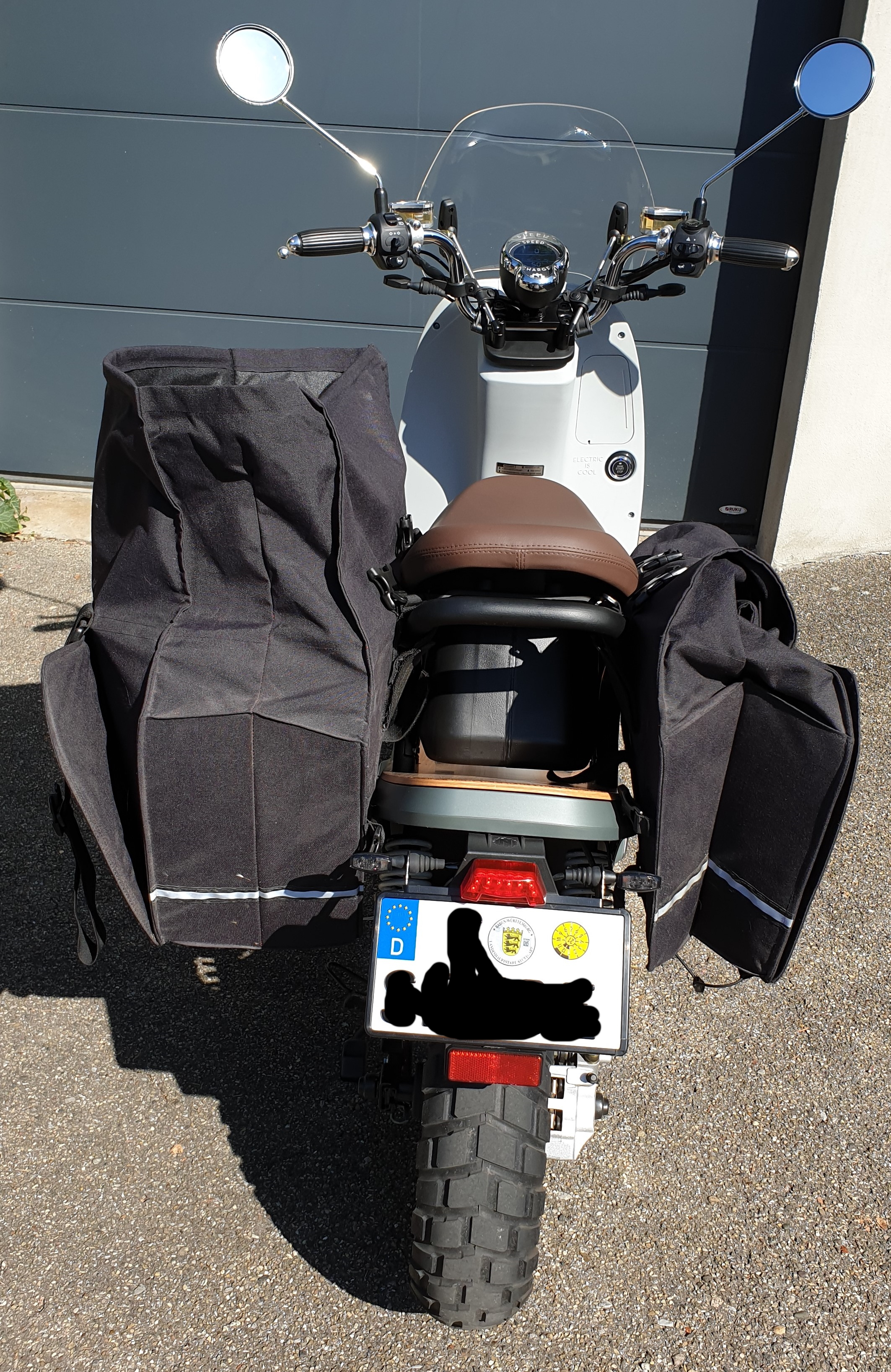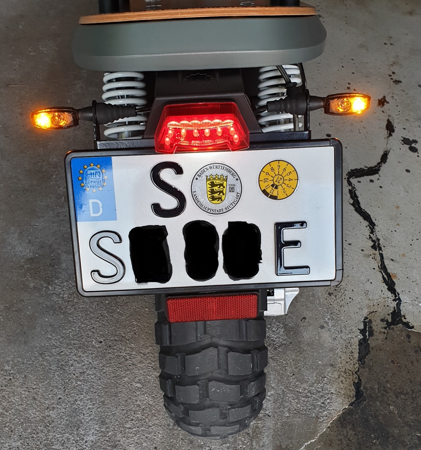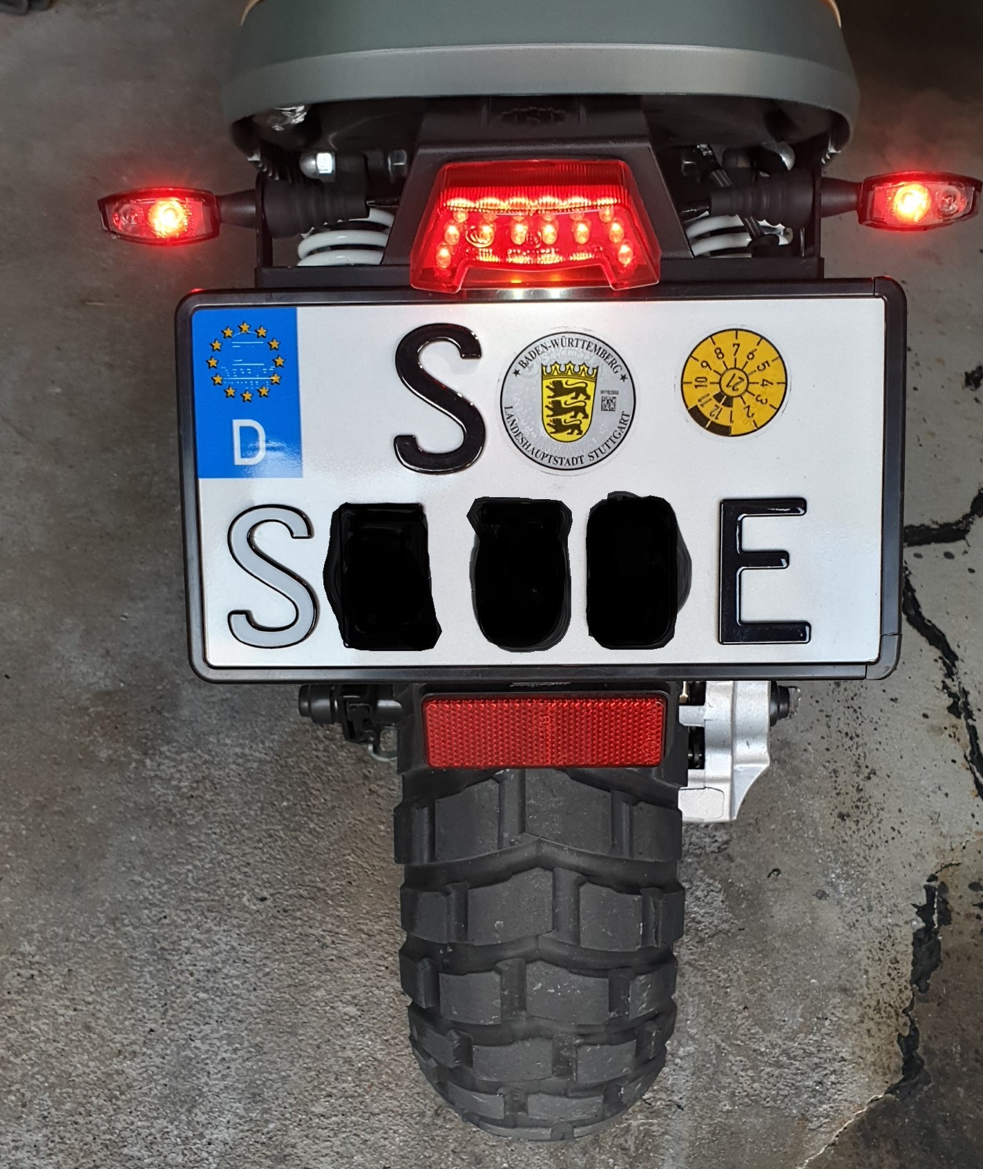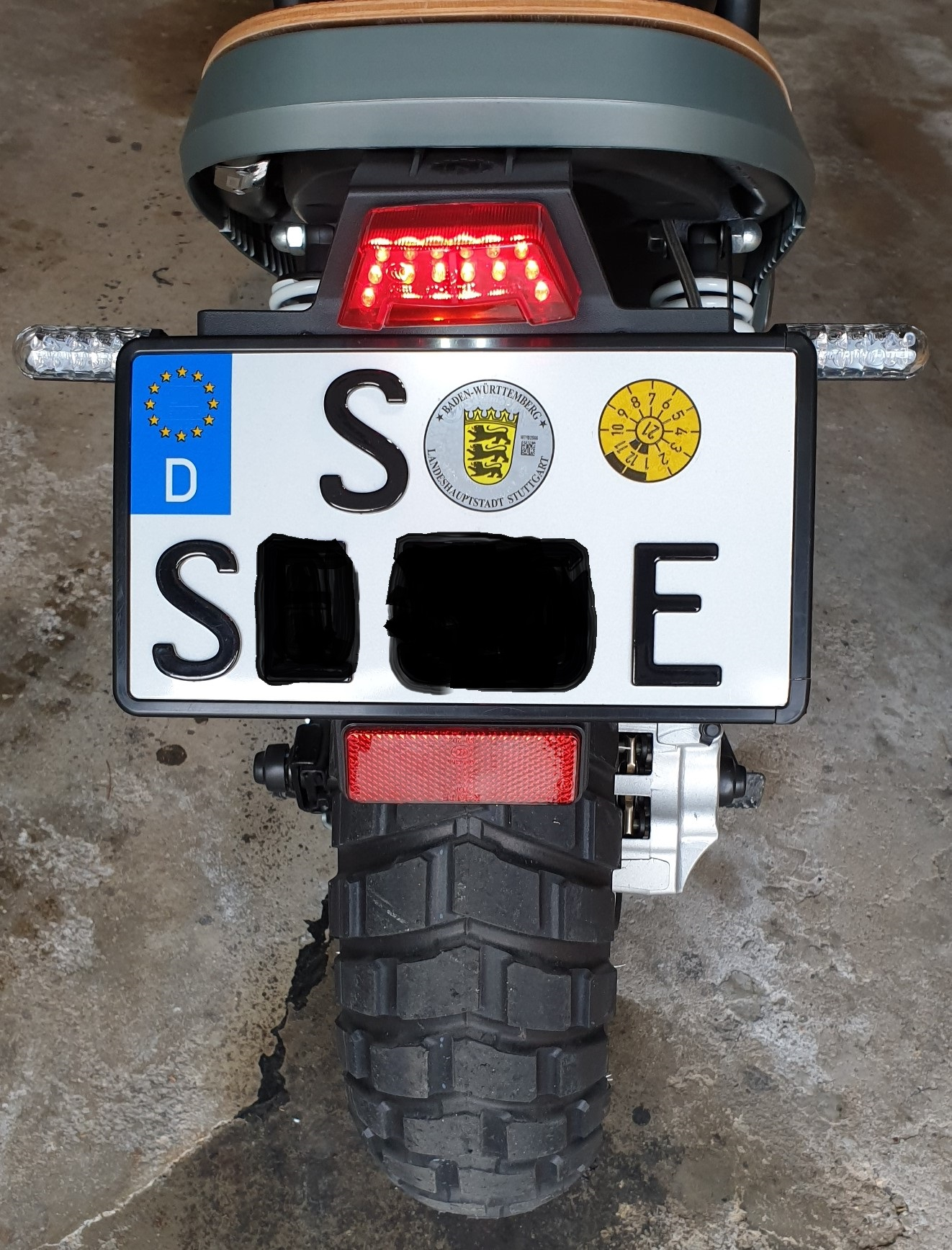 Weil ich den Kennzeichenhalter des NES für die schmalen Leichtkraftkennzeichen in D für zu lange halte, habe ich das Kennzeichen direkt oben unter das Rücklicht montiert, den unten überstehenden Teil des Halters gekürzt und damit den unteren Rückstrahler hoch gesetzt.