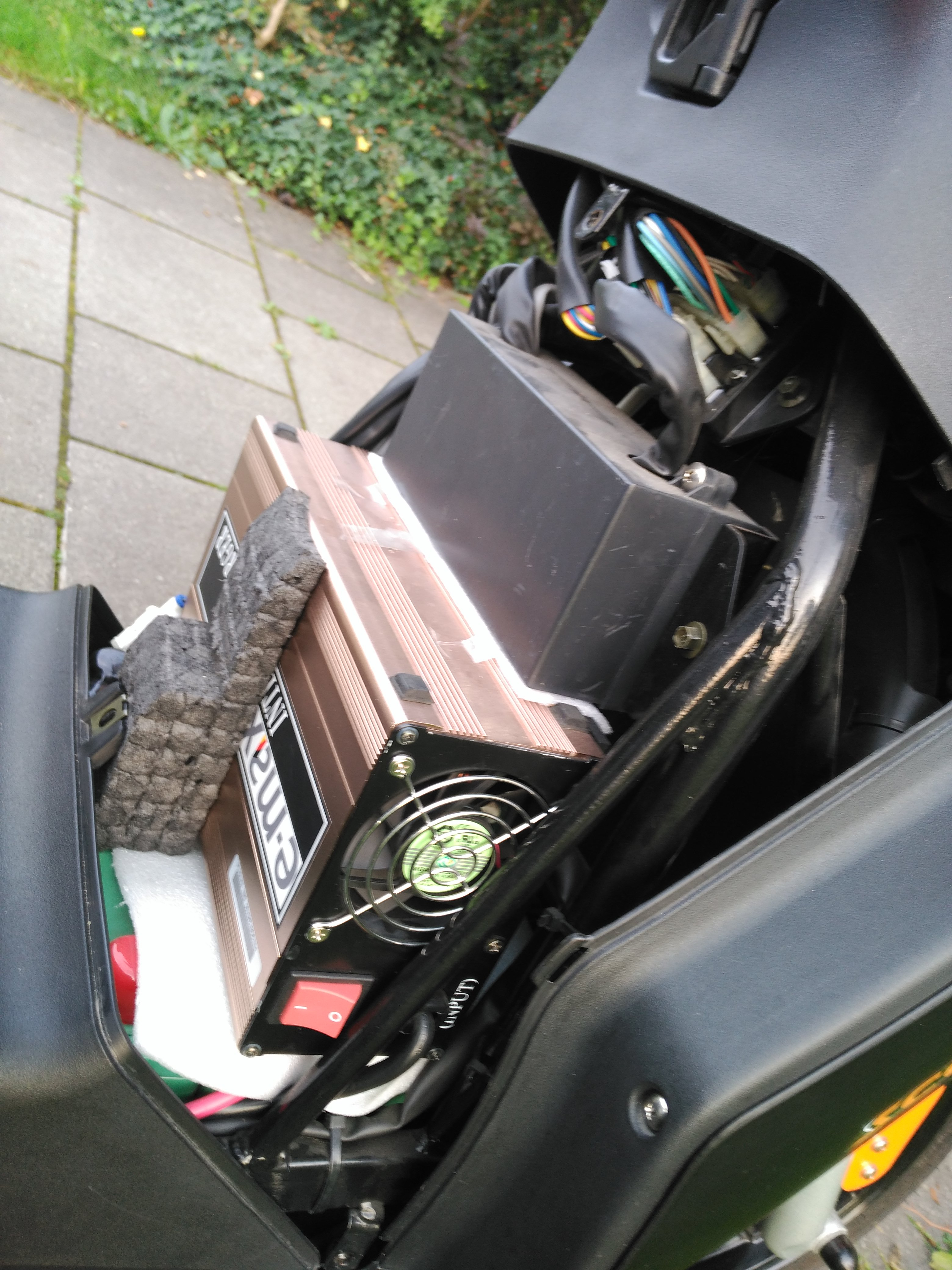 Der Vorbesitzer hat das originale Ladegerät im Vorbau fest untergebracht (Bild). Scheint damit viele Jahre (er hat es damals neu gekauft) problemlos rumgefahren zu sein (km 5000). Er hat es zwar mit dünnem Schaumstoff gepolstert, aber ich bin trotzdem überrascht, dass sich im Ladegerät nichts losgeschüttelt hat. Ein Bild davon hab ich angehängt. Eine Verkleidungsseite hat er mit Wärmeschutzfolie ausgekleidet, dort wo der Lüfter ist.