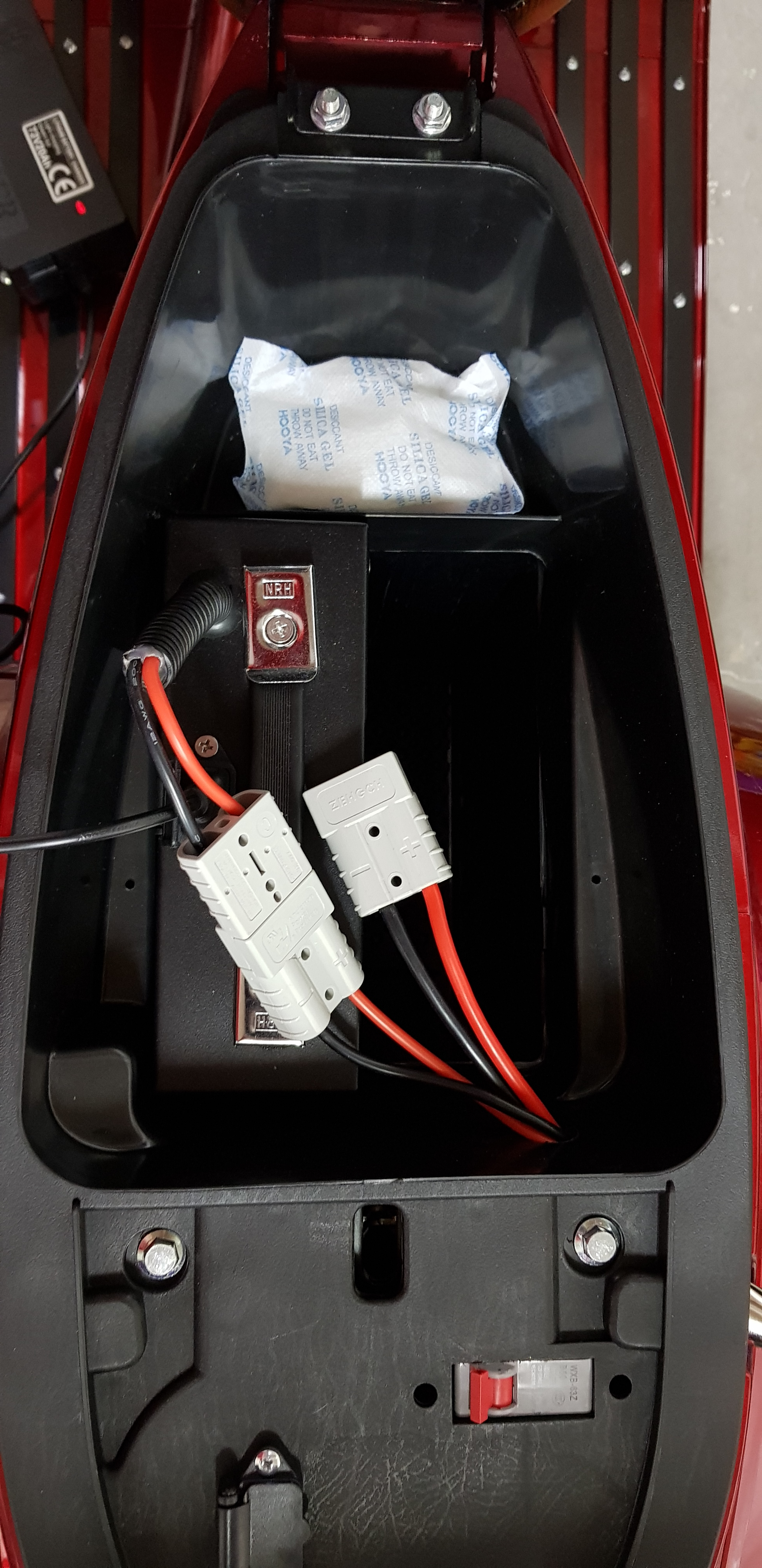 Mit dem "original" Anschlusskabel, das mir der freundliche FUTURA-Mitarbeiter geschickt hatte, habe ich den zweiten Akku fest verkabelt. Zum Laden möchte ich die Ladebuchse im Roller verwenden. Dann brauche ich zum Laden die Akkus nicht voneinander zu trennen. Dazu habe ich mir, nach Rücksprache mit FUTURA, ein 5A-Ladegerät geordert. Bin mal gespannt, wie lange der Ladeprozess dauert - wenn das Gerät denn mal hier ist.