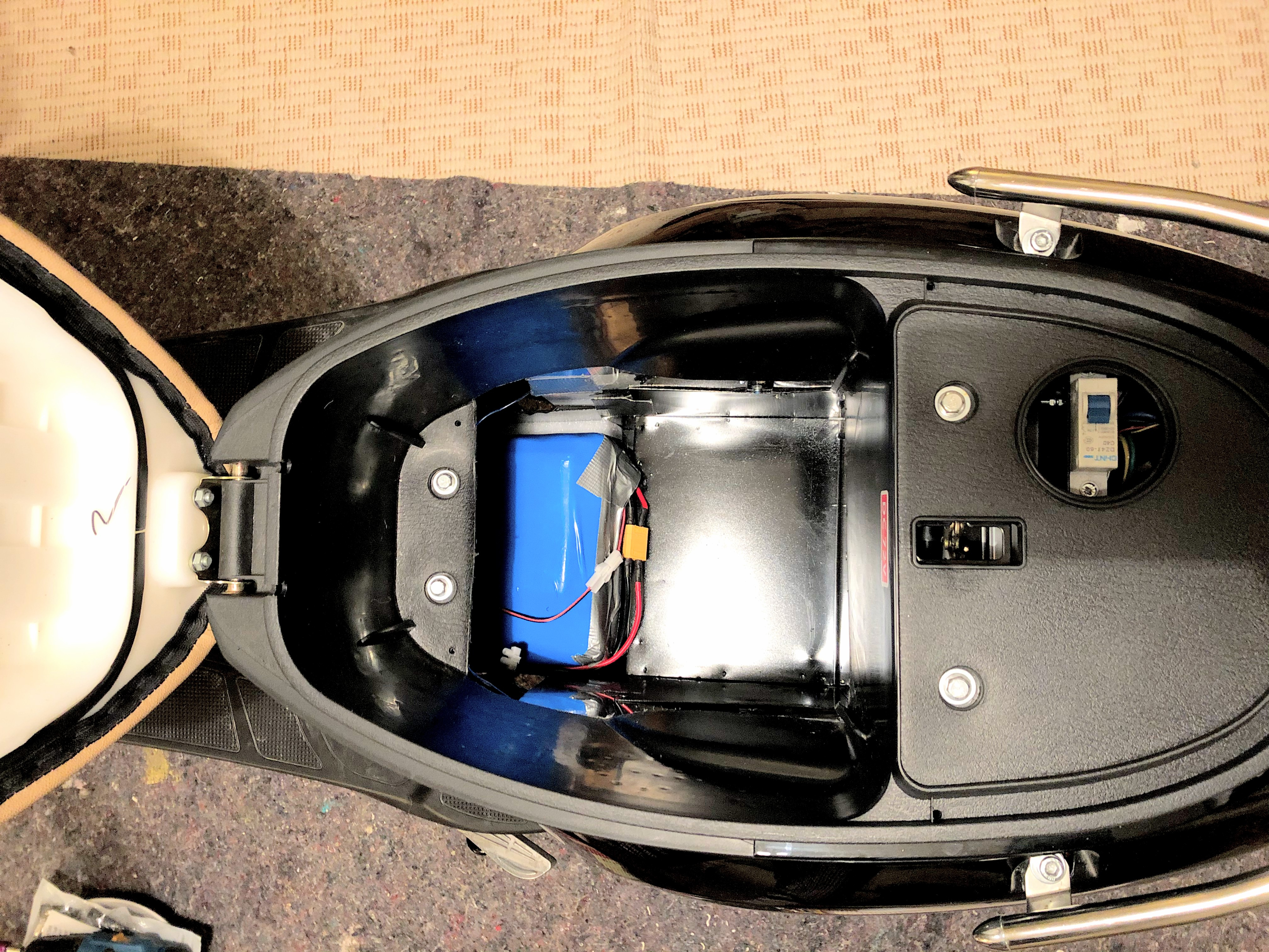 In Summe sollte der Roller durch den Umbau immer noch gut 15kg leichter sein als vorher und was noch wesentlicher ist, eine Reichweite von ca. 100km haben. Auch sollte das Fach unter dem Sitz durch herausschneiden des Bodens nach unten erweitert werden können, weil nur das untere Akkufach weiterverwendet wird und das obere komplett frei bleibt.