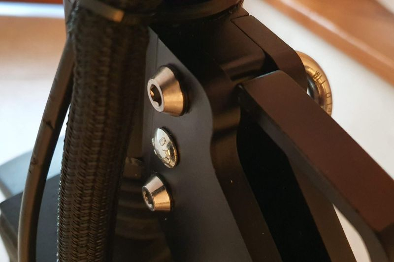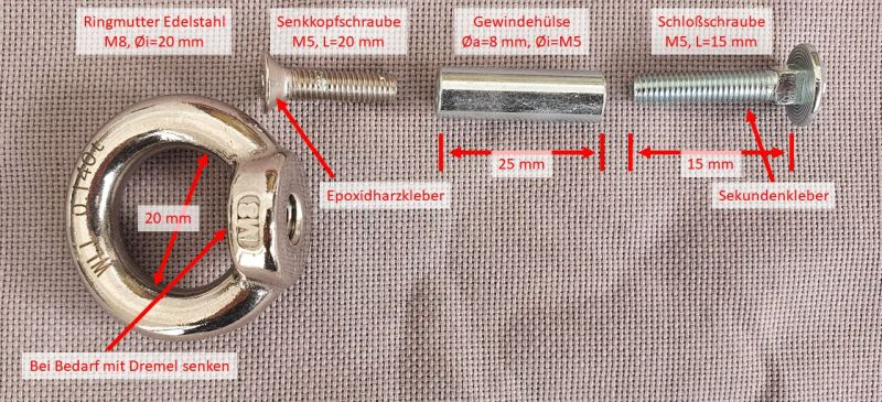 Die Komponenten kommen aus dem lokalen Hornbach (~7€). Da nur gegossene Ringschrauben vorhanden waren, habe ich eine Ringmutter aus Edelstahl genommen (rein optische Gründe). Die Kreuzschlitzschraube kann bei eingelegtem Schloss nicht geschraubt werden. Das Drehen der Ringmutter ist max 1/2 Umdrehung möglich und durch die Gewindehülse ist ein etappenweises Ausdrücken der Schlossschraube quasi nicht möglich. Und die ganz Heiklen können ja das Kreuz mit einem Dremel ausfräsen...