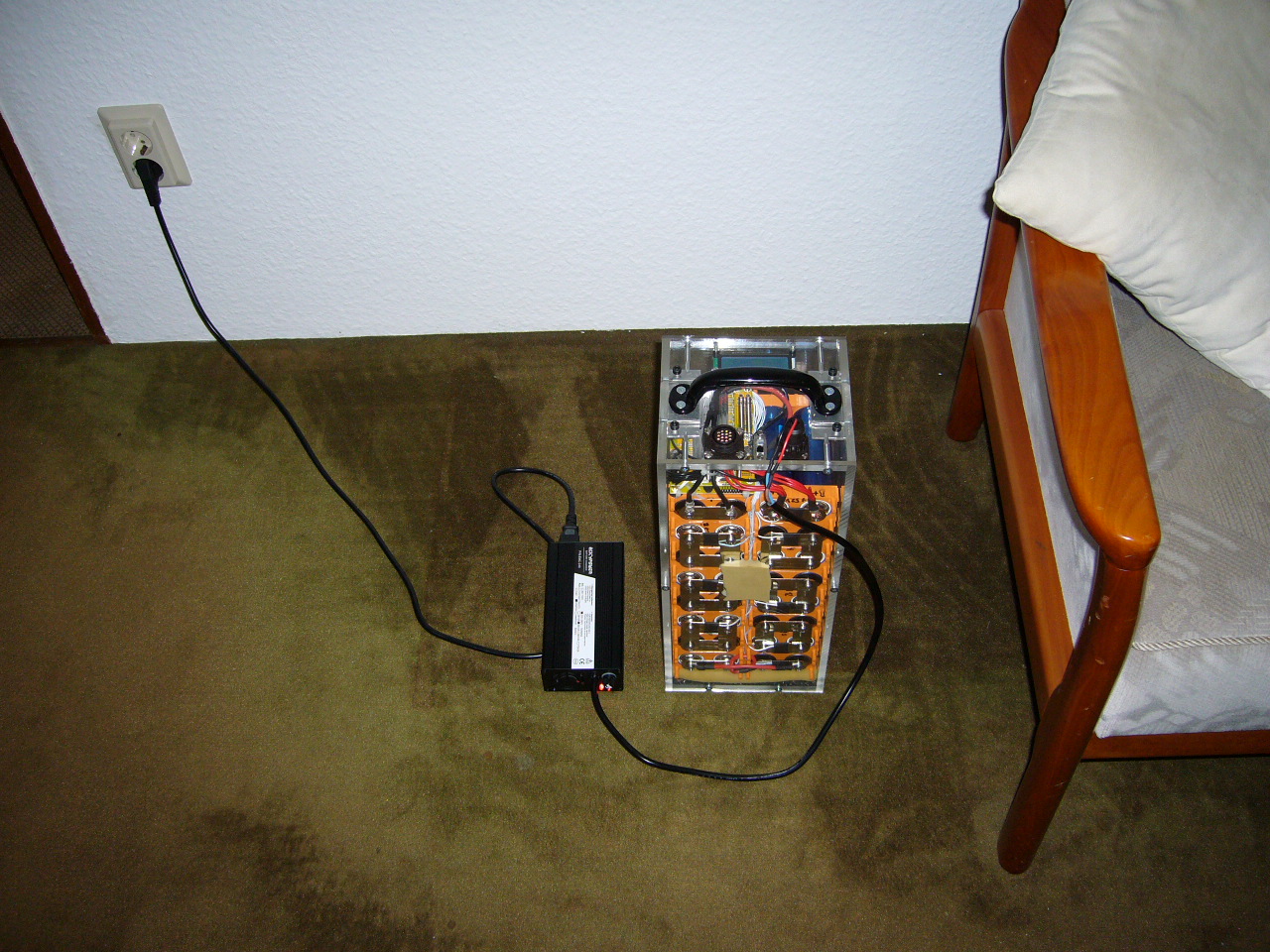 Ist aber m.E. Blödsinn Blei durch Blei zu ersetzen, deshalb habe ich auch gleich konsequent Lithium eingebaut: 50kg Blei wurden durch 12kg Lithium ersetzt. Natürlich ist der Akku HERAUSNEHMBAR, was denjenigen entgegenkommt, die keine Steckdose in Rollernähe haben.