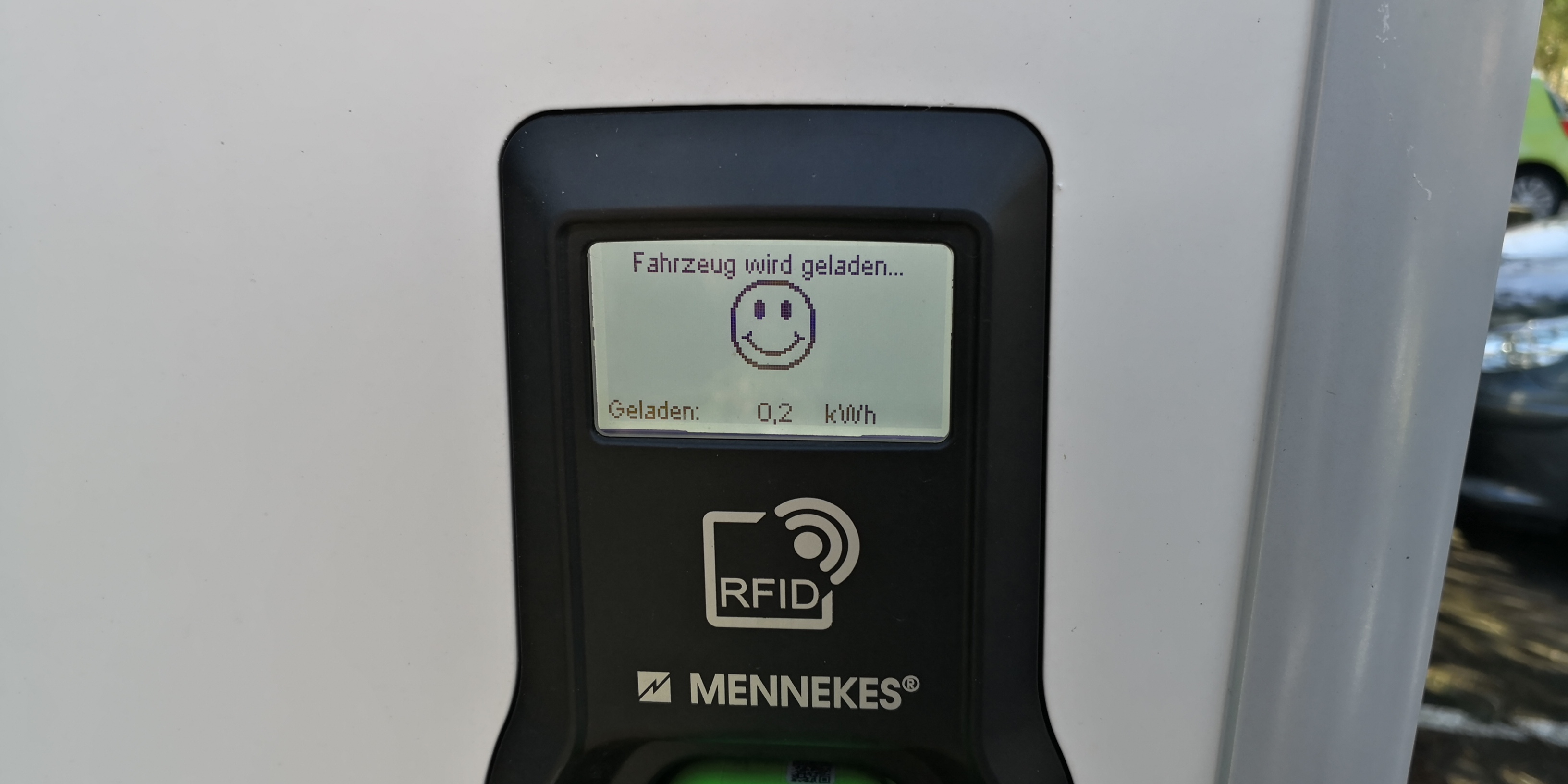 Man steht also an der Säule, die man sich oder vielmehr die App ausgesucht hat. Es funktionieren auch nur Säulen mit einer Steckdose, nicht die, wo schon ein Kabel dran ist!