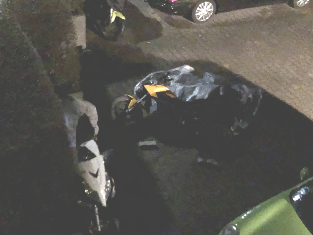Ja, im Nachinein betrachtet wäre der Sturm ohne Haube vielleicht glimpflicher für‘s Mopped abgegangen. Letzte Nacht habe ich das schon so gehalten, aber noch wichtiger habe ich es quer gestellt, so wie das Mopped vom Nachbarn im Hintergrund.