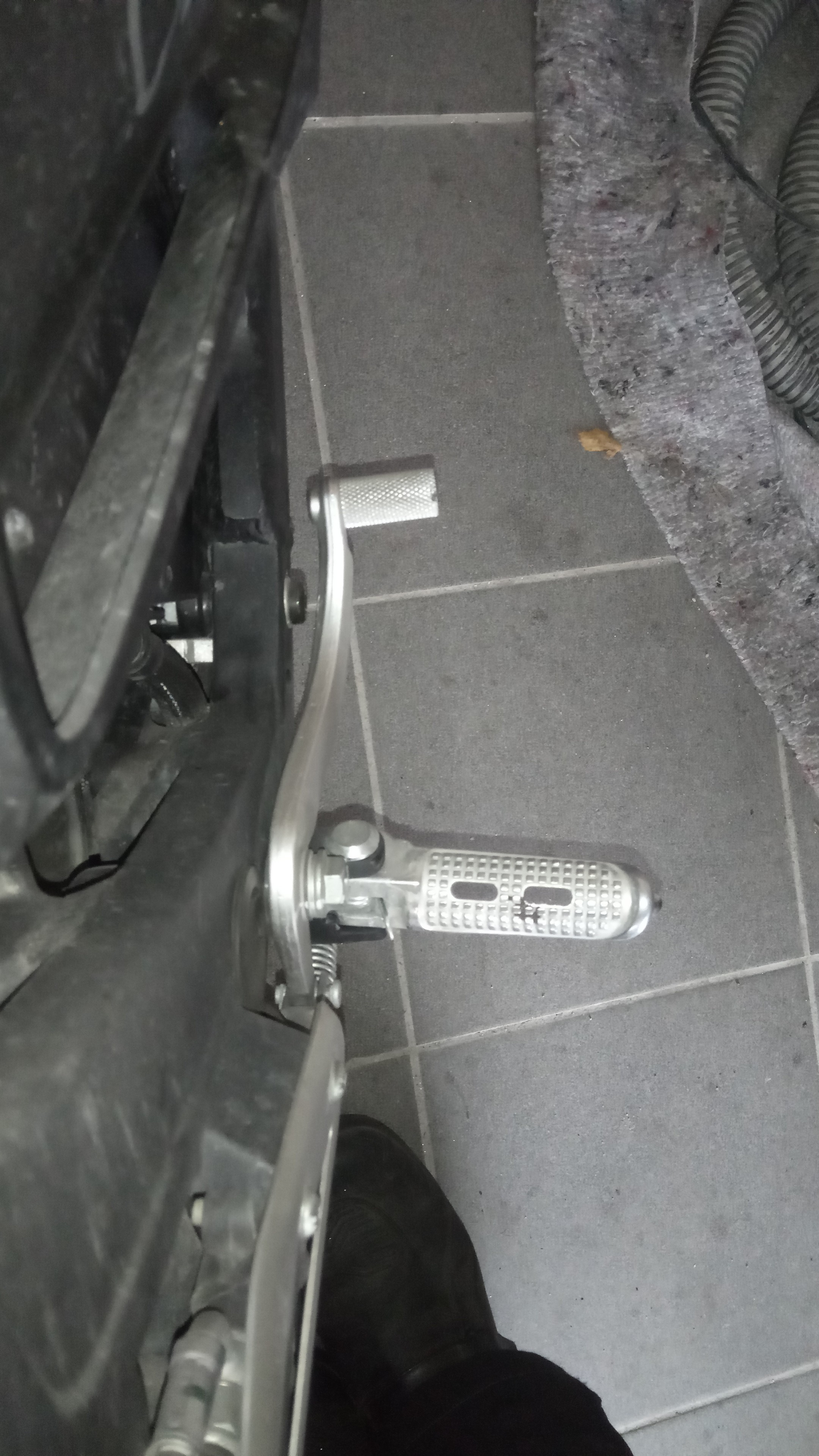 Die Fußraste rechts kippt schräg nach hinten oben ab beim Kurvenräubern, doch beim auf die rechte Seite kippen war das eine solche Kraft nach rein oben, dass es den oberen Anschlag der Fußraste verformt hat. Musste sie manuell runterklappen. Wird wohl beim Iso-Termin Anfang März ersetzt werden müssen...