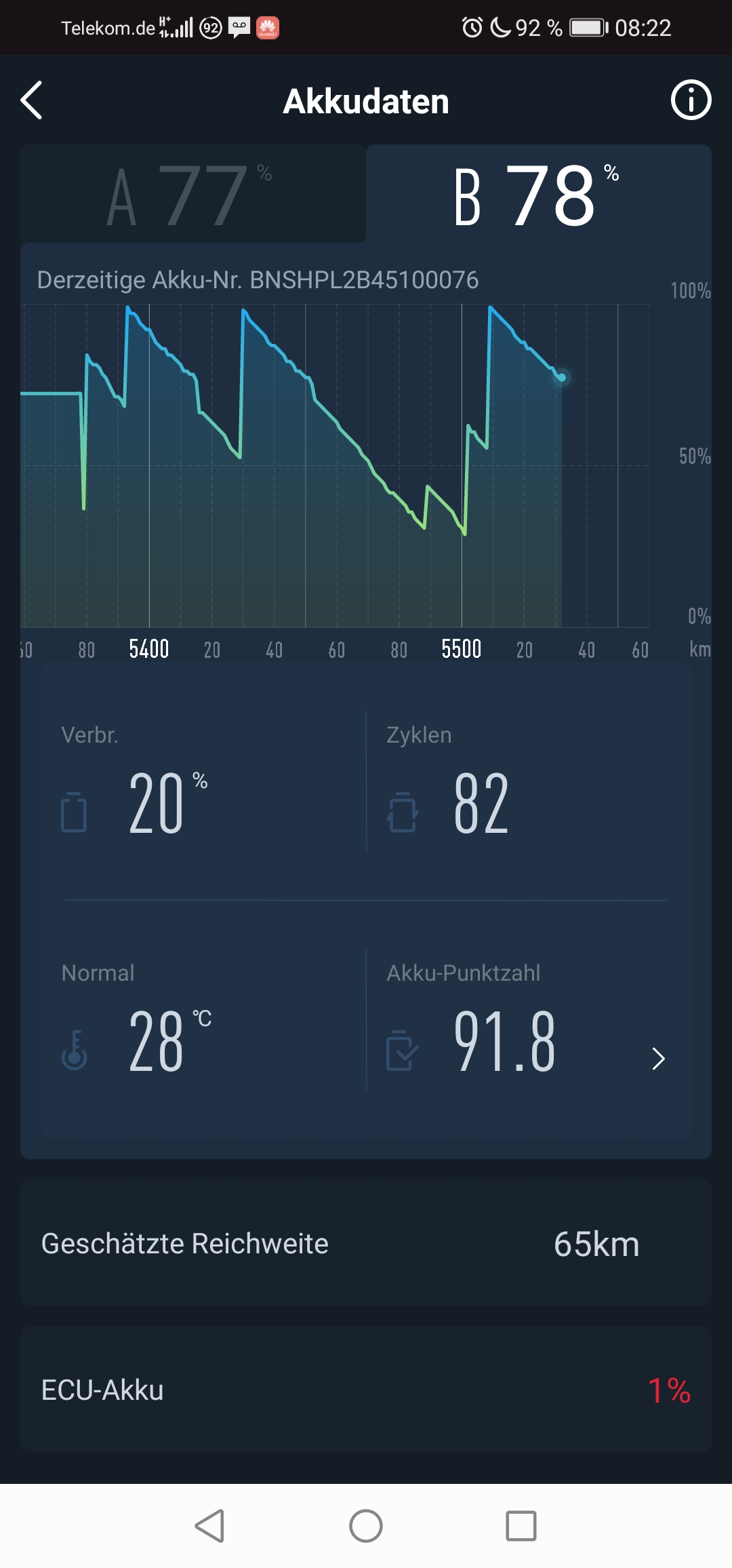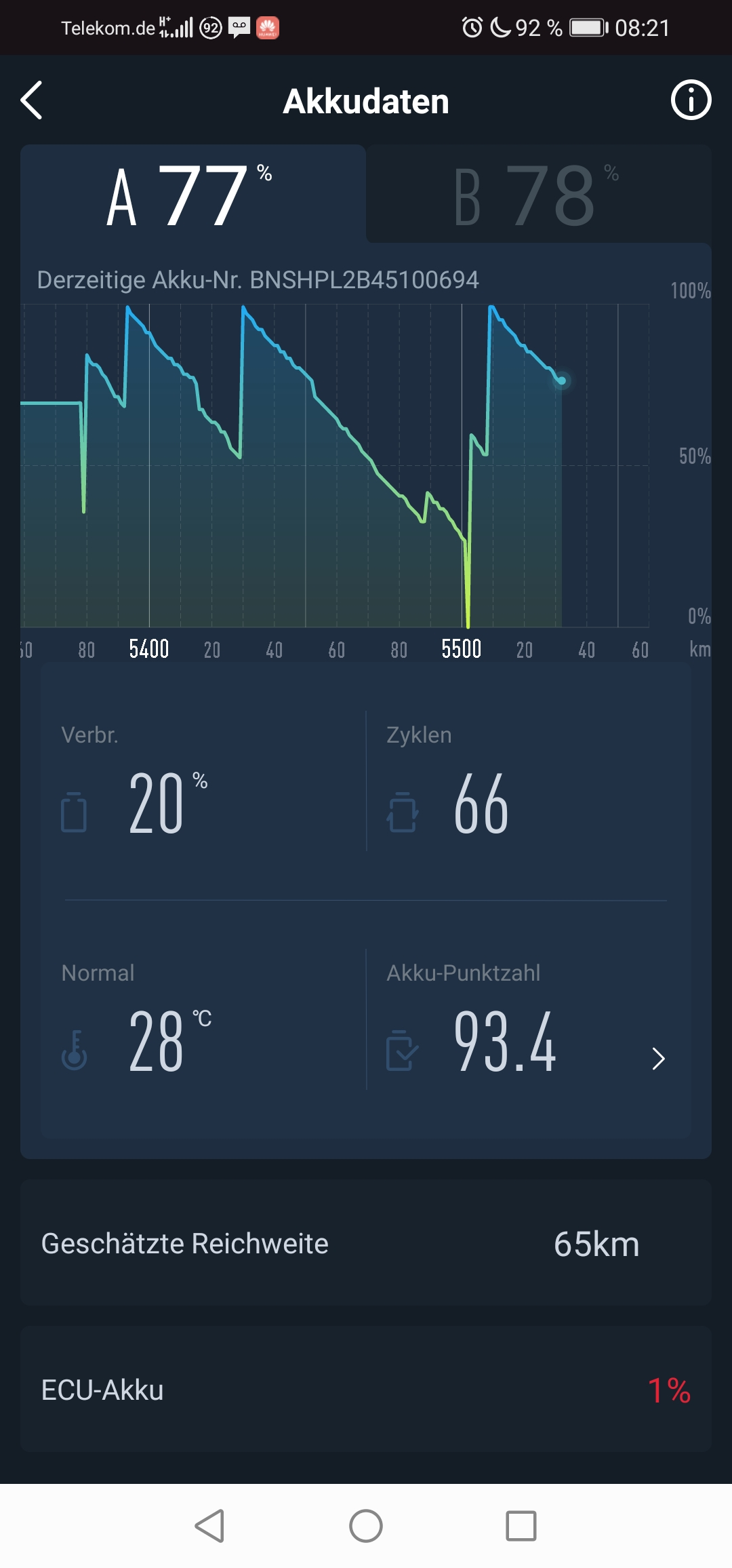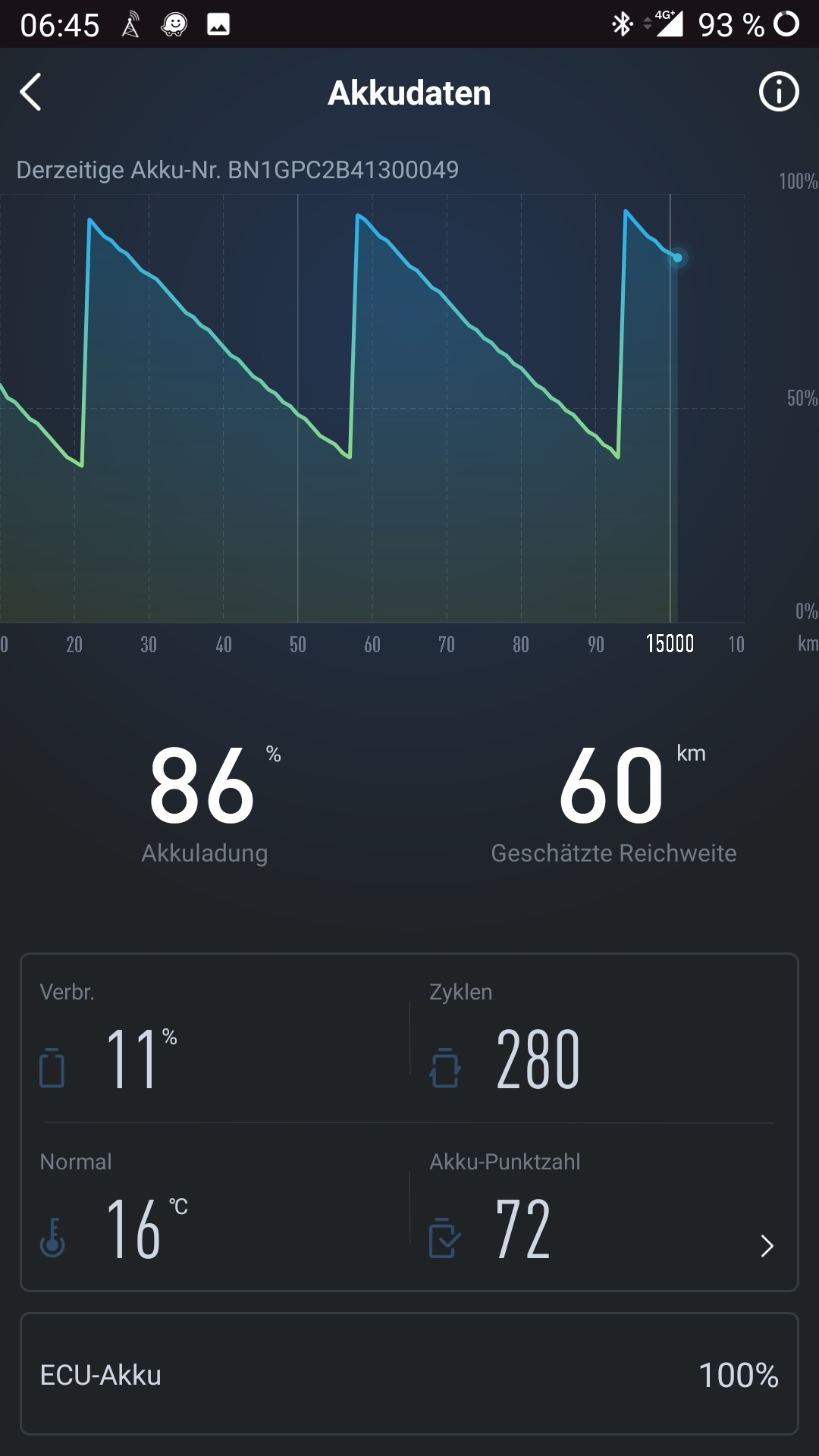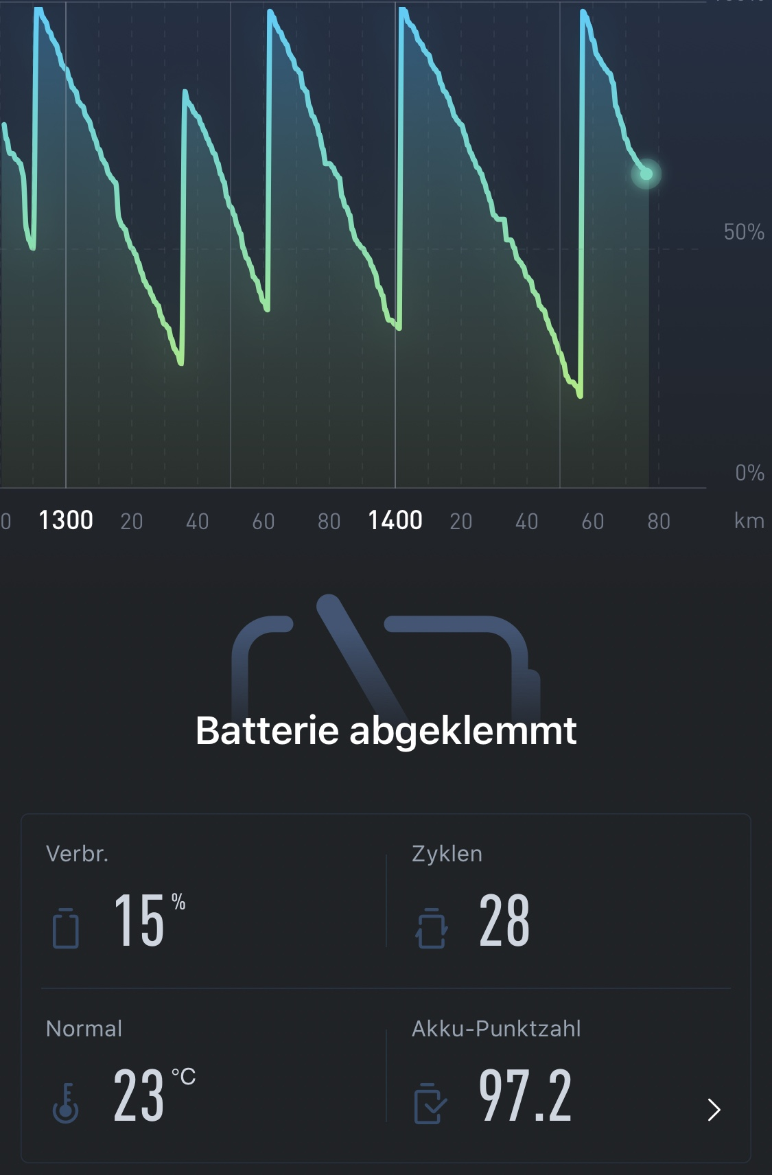 Ich würde sagen, dass mit nur noch 59 Niu-Punkten (das hat bei 100 angefangen...) nach 410 Gesamtladezyklen durchaus dem Akku etwas anzumerken dürfte. Bin gespannt auf die Antwort von @HALODRI.
