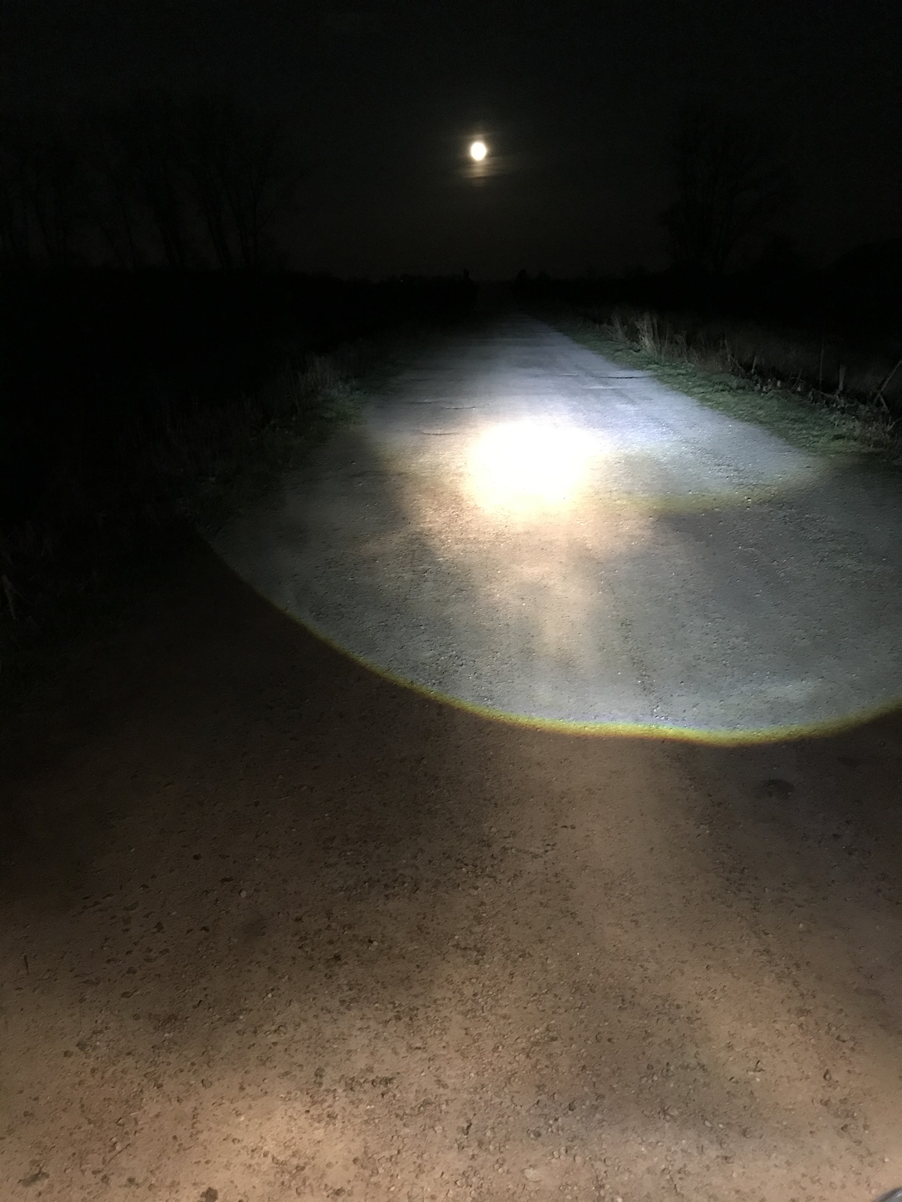 Hier der direkte Vergleich der Leuchtkegel, beim fahren direkt am Deich sieht man auf der Böschung direkt die Hell/ Dunkelgrenze. Der kleine Bursche ist ein H-BLACK PRO E-BIKE 6-12V von Herrmann.