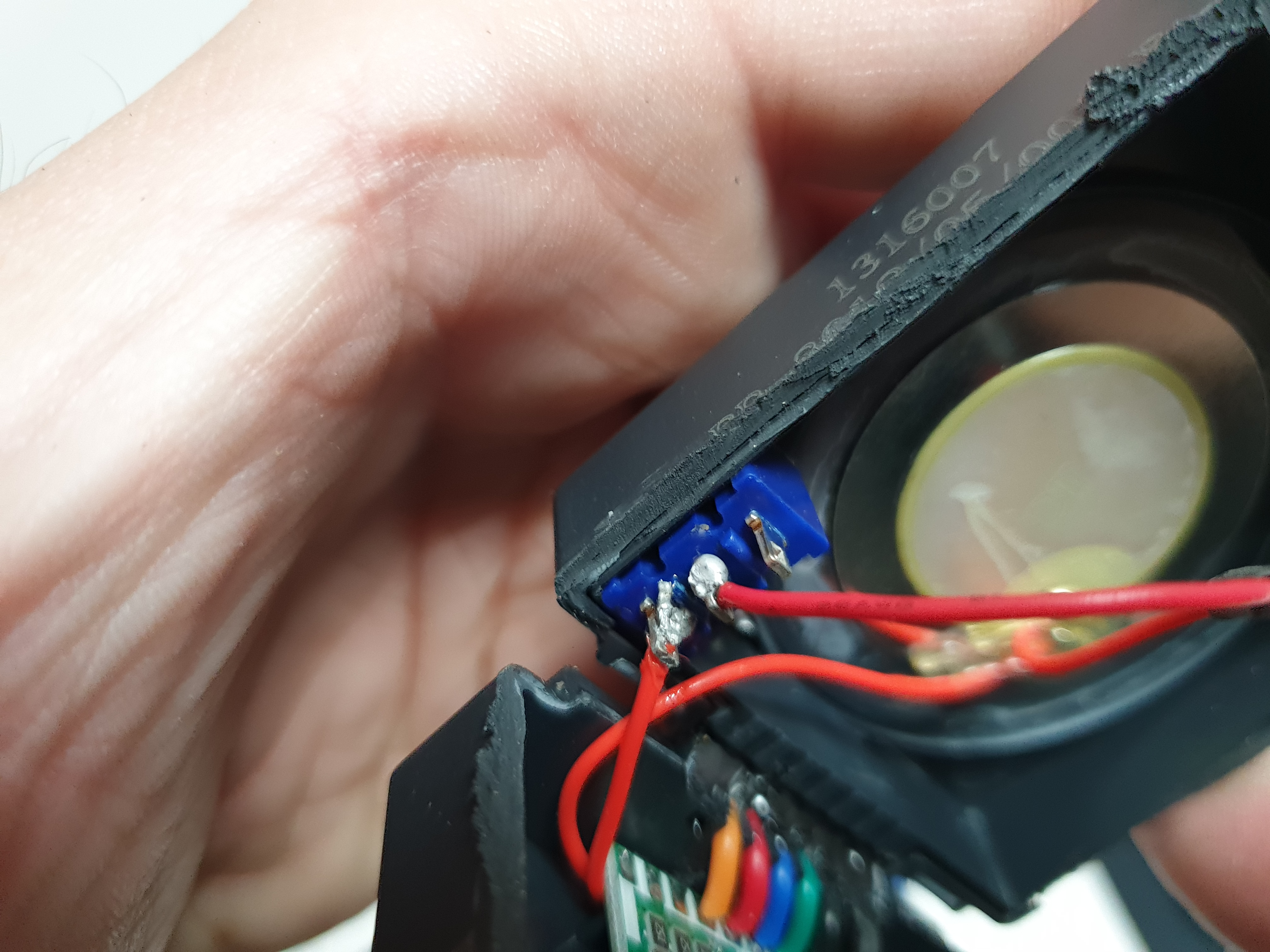 Wenn das Gehäuse geöffnet ist, sieht man die beiden roten Leitungen zu dem Lautsprecher.